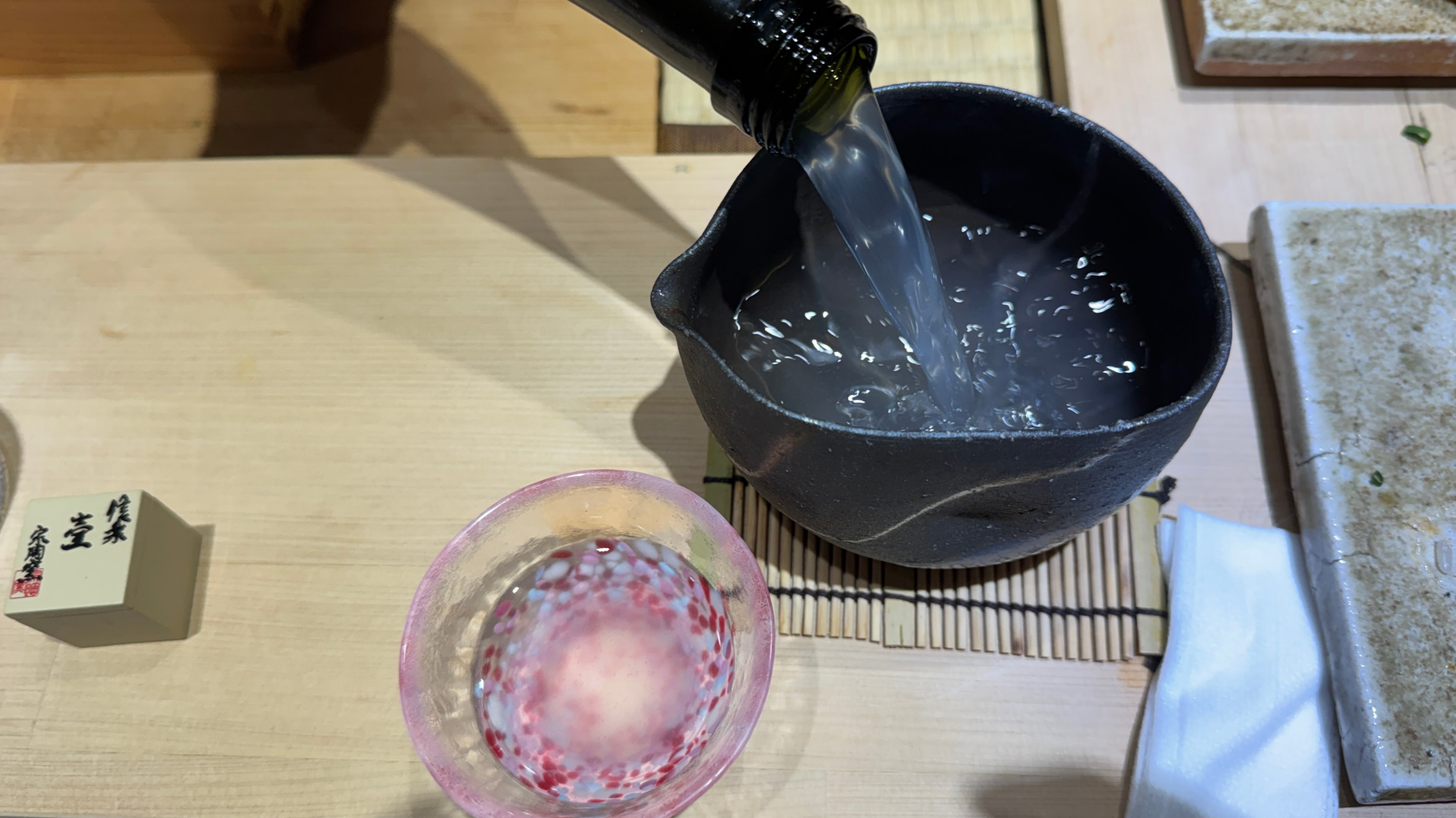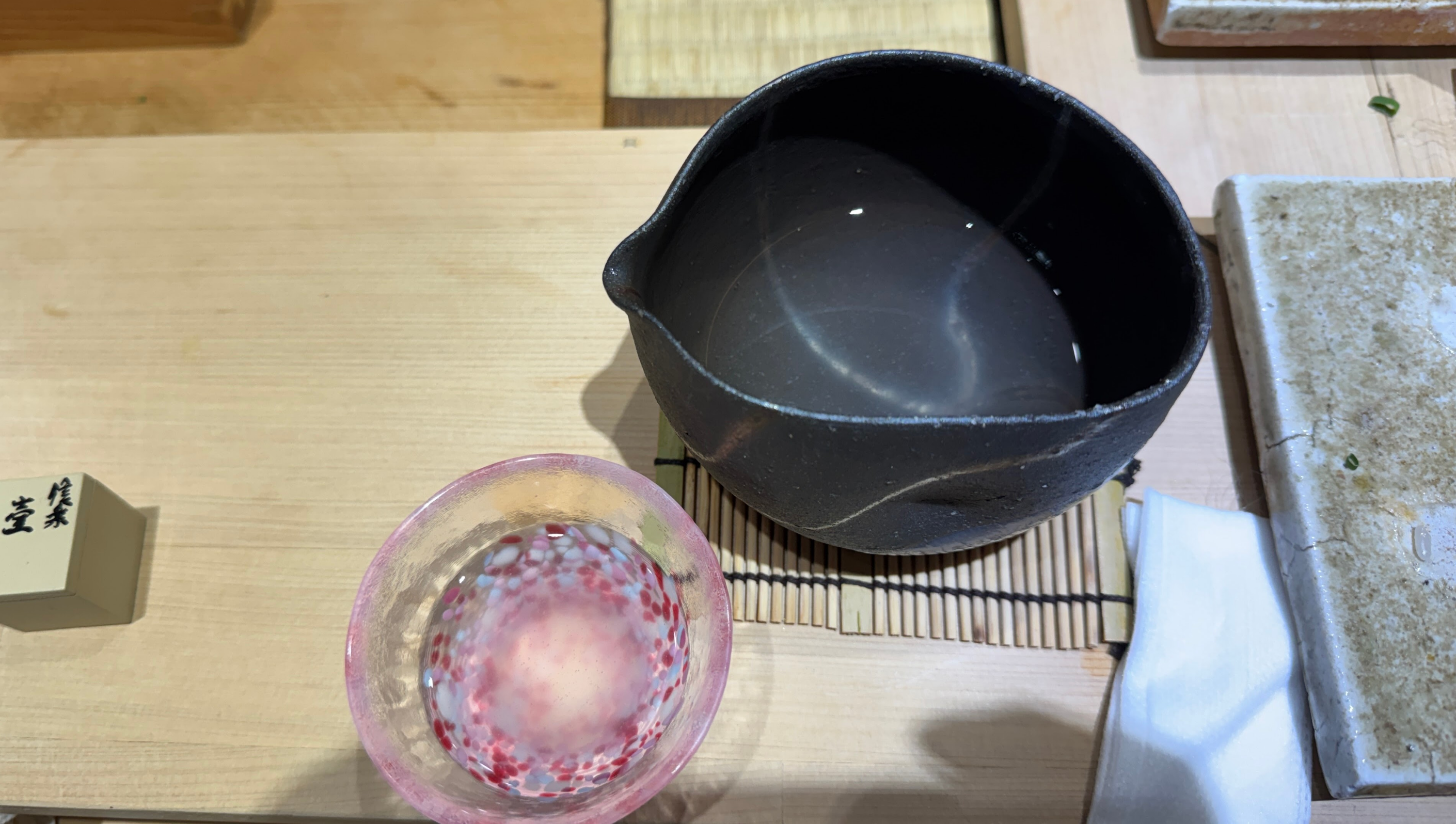 2025년 첫 스시이젠. 수저와 젓가락, 받침대가 바뀌었다. 스시를 놓아주시는 접시도. 예전 검은 접시보다는 확실히 내 취향. 셰프님 그릇 욕심은 확실하시다 ㅋㅋㅋㅋ 도쿠리도 참 예쁘다. 사고