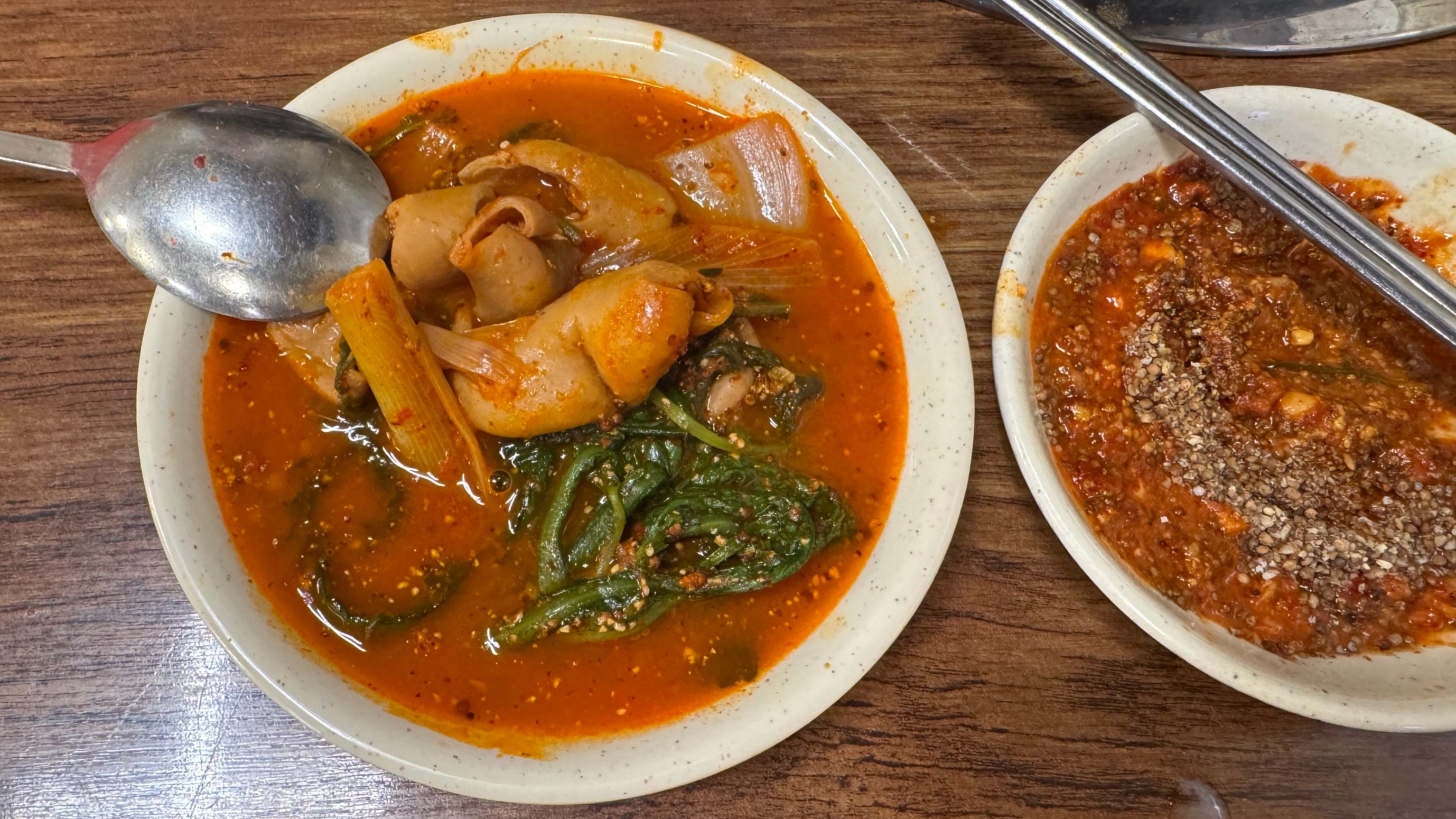 근데, 이거 제법 맛있네. 딱 적당한 맵기에 쫄깃한 식감, 기분 나쁜 잡내도 거의 없다. 그리고 오른쪽의 새콤 매콤한 들깨 소스가 완전 킥. 물리지 않고 계속 들어간다.