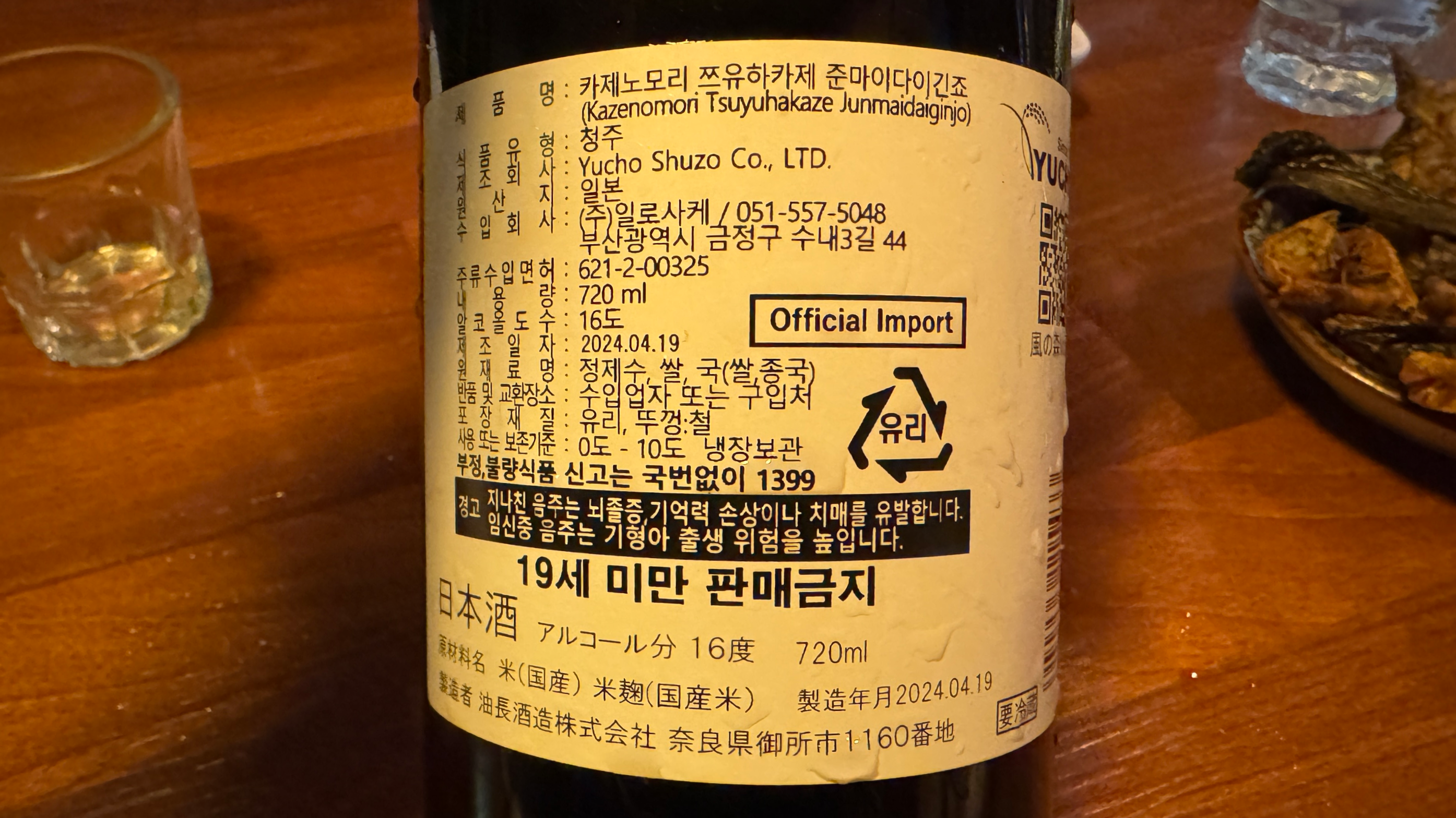 카제노모리 츠유하카제507(風の森 露葉風507). 잔 벽에 버블이 맺힐 정도로 탄산감이 살아있으며, 은은한 과일 풍미와 함께 가벼운 단맛이 편안한 미감을 선사한다. 목 넘김 후에도 알코올감이 거의 느껴지지 않으며, 피니시가 비교적 깔끔하게 떨어진다. 구조감도 좋고 단아하고 우아한 스타일도 마음에 드는 사케.