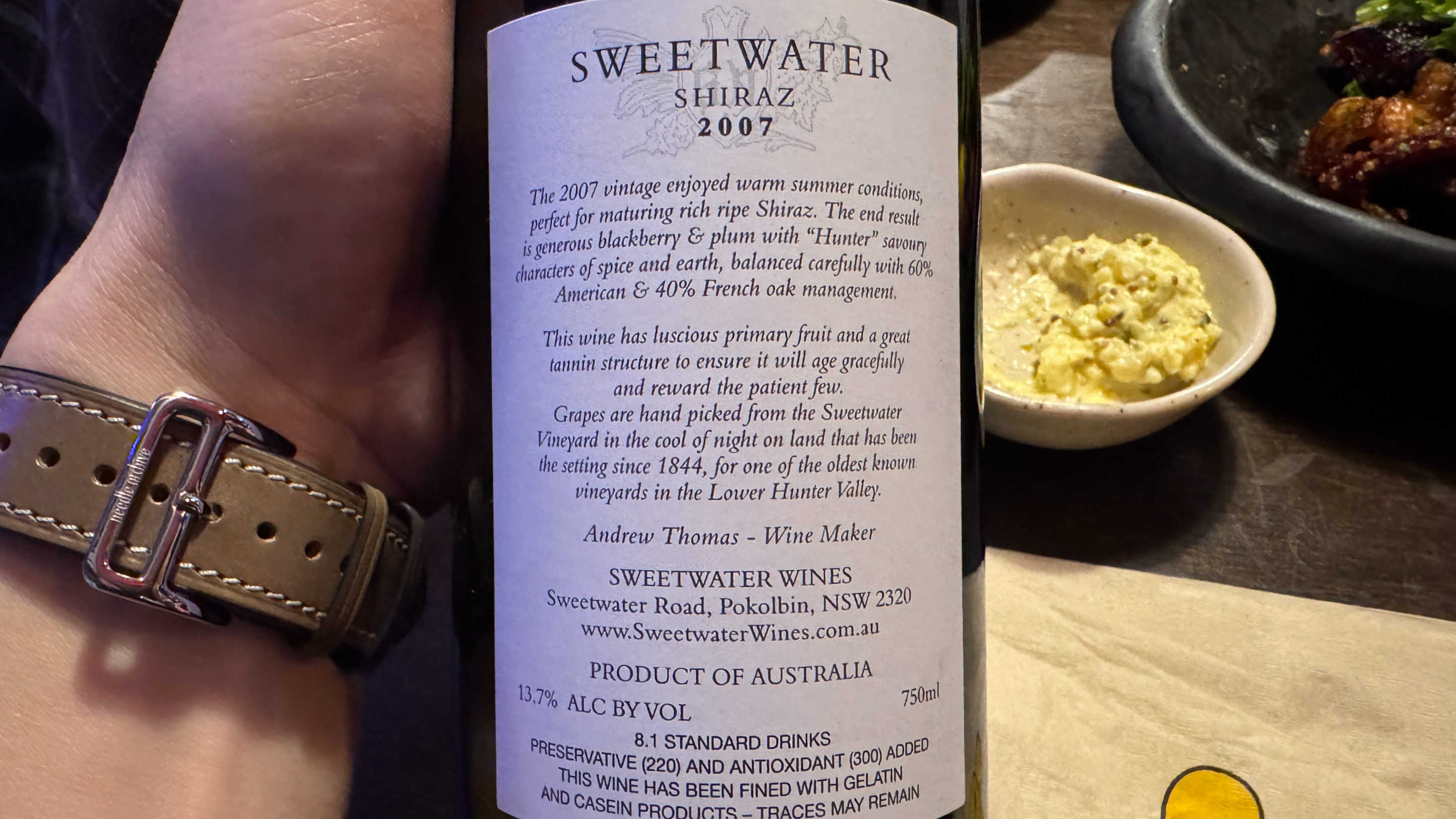Sweetwater, Hunter Valley Shiraz 2007. 지인이 호주 와이너리에서 마셔 보고 직접 핸드 캐리해 온 녀석이다. 일단 2007년이라는 빈티지에 놀라고, 13.7%라는 클래식한 도수에 다시 한번 놀라고...