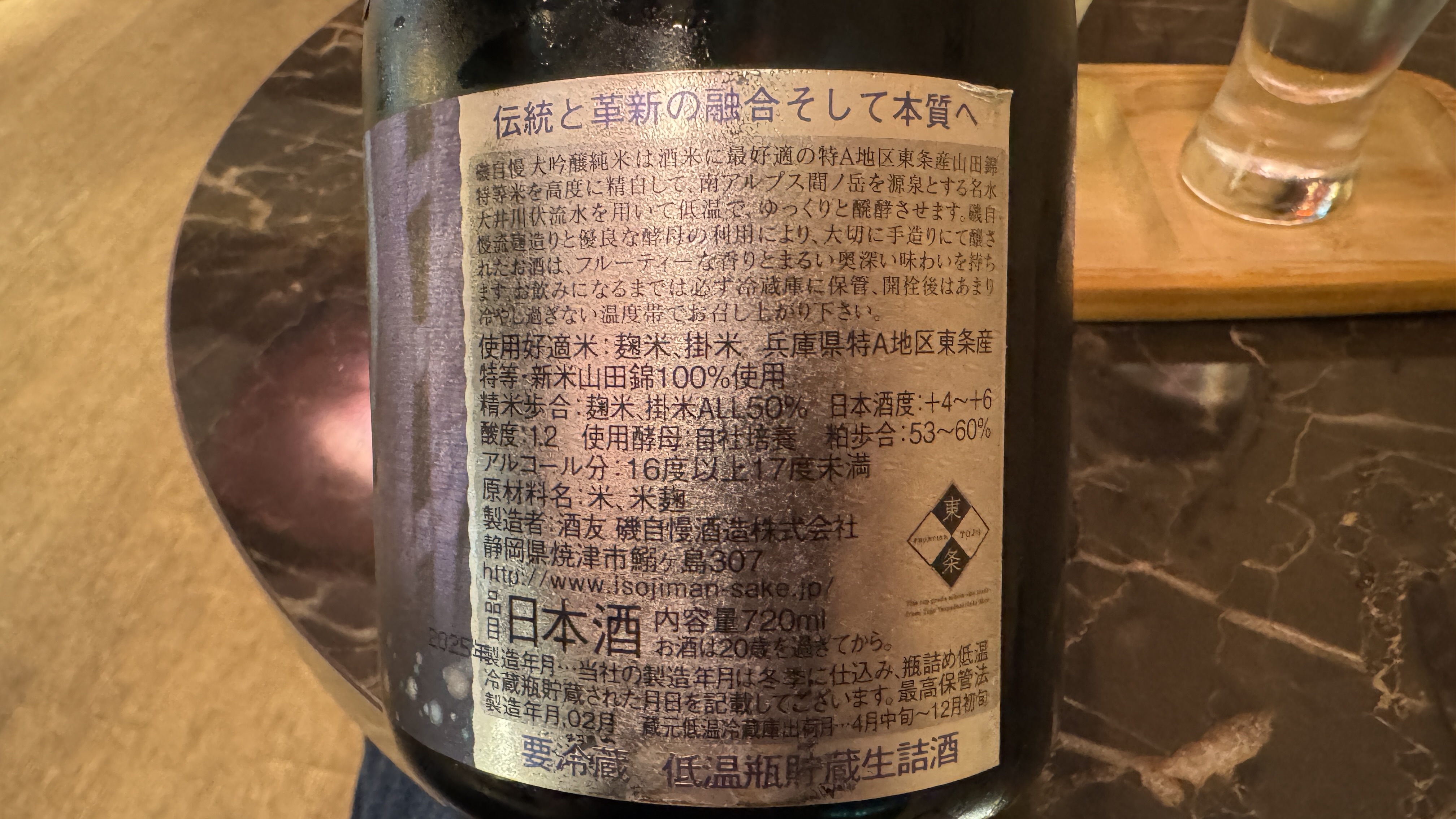 이소지만 다이긴조준마이(磯自慢 大吟釀純米). 왜 준마이다이긴조가 아니고 다이긴조준마이일까ㅋ 어쨌거나 셋 중 가장 드라이한 미감에 감칠맛이 강하다. 독특한 풍미 덕에 초콜릿 혹은 진한 향신료가 떠오를 정도. 하지만 견고한 구조감 속에 미묘한 단맛이 숨어 있어 마실 수록 편안해진다.