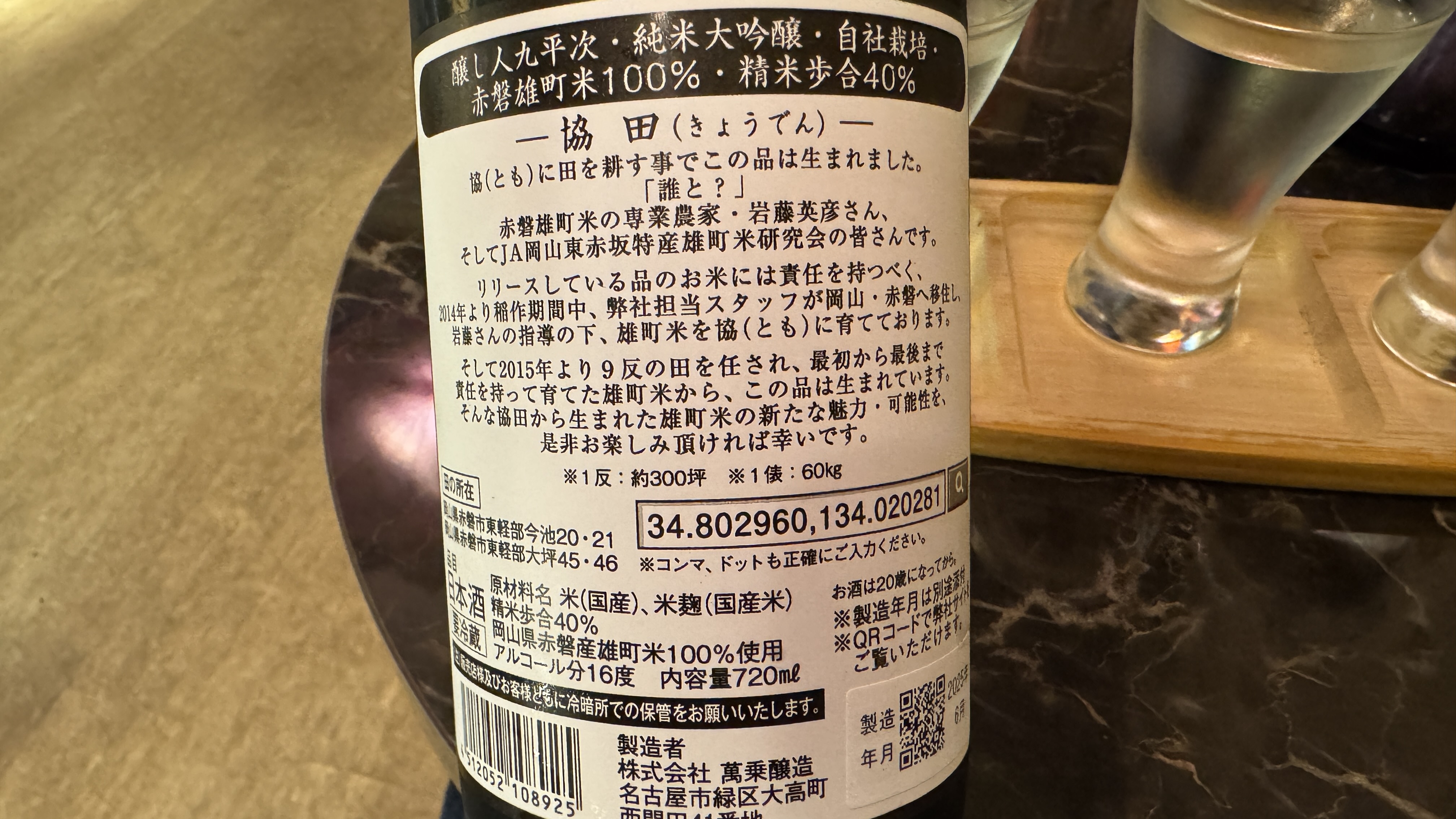 카모시비토 쿠헤이지 쿄우덴 준마이다이긴조(釀し人九平次 協田 純米大吟釀). 노란 과일과 열대 과일 풍미에 앞의 사케보다는 묵직한 바디와 구조감이 느껴진다. 가벼운 단맛에 여운은 긴 편인데, 오픈한 지 조금 오래됐는지 다소 시큼한 느낌이 들었다.