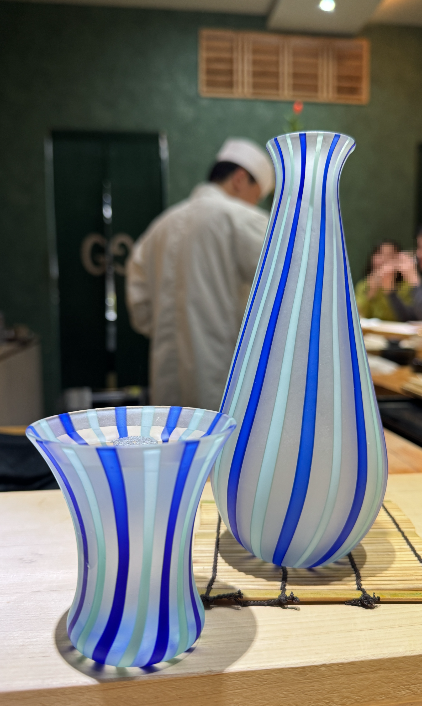 새 잔과 도쿠리. 개인적으로 좋아하는 스타일은 아니지만, 이런 곳에서 한 번씩 사용하는 건 좋다. 평상시에 안 쓰던 걸 사용해 보는 즐거움이랄까. 사케 이름인 '모던'과도 잘 어울리는 것 같고.