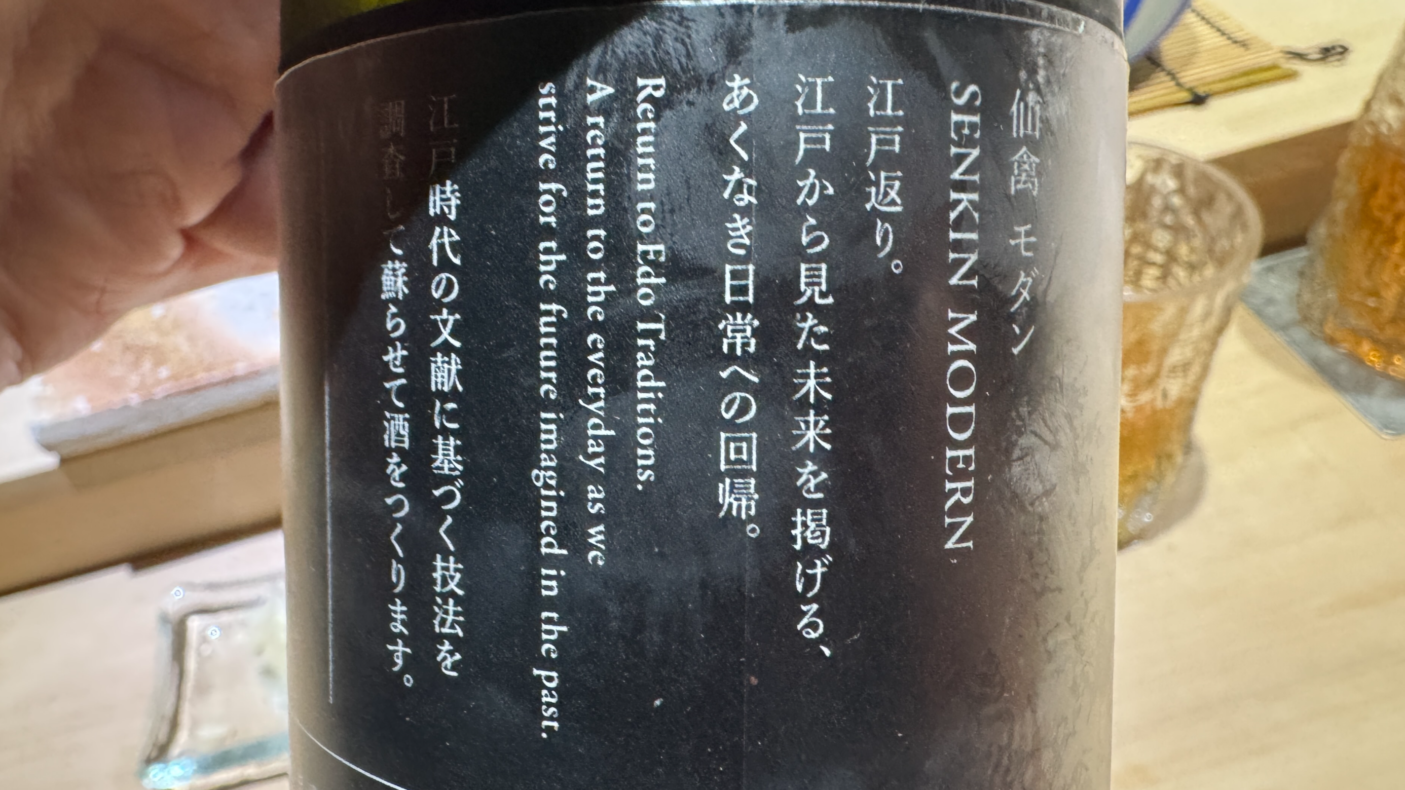 에도(江戶) 사케의 전통으로 돌아가 새로운 것도, 오래된 것도 아닌 선한 것을 최고로 여기며 자연과 함께 술을 만들자는 모토가 적혀 있다. 야마다니시키(山田錦) 100%의 준마이슈(純米酒)인데 정미보합은 비공개. 알코올 13%.