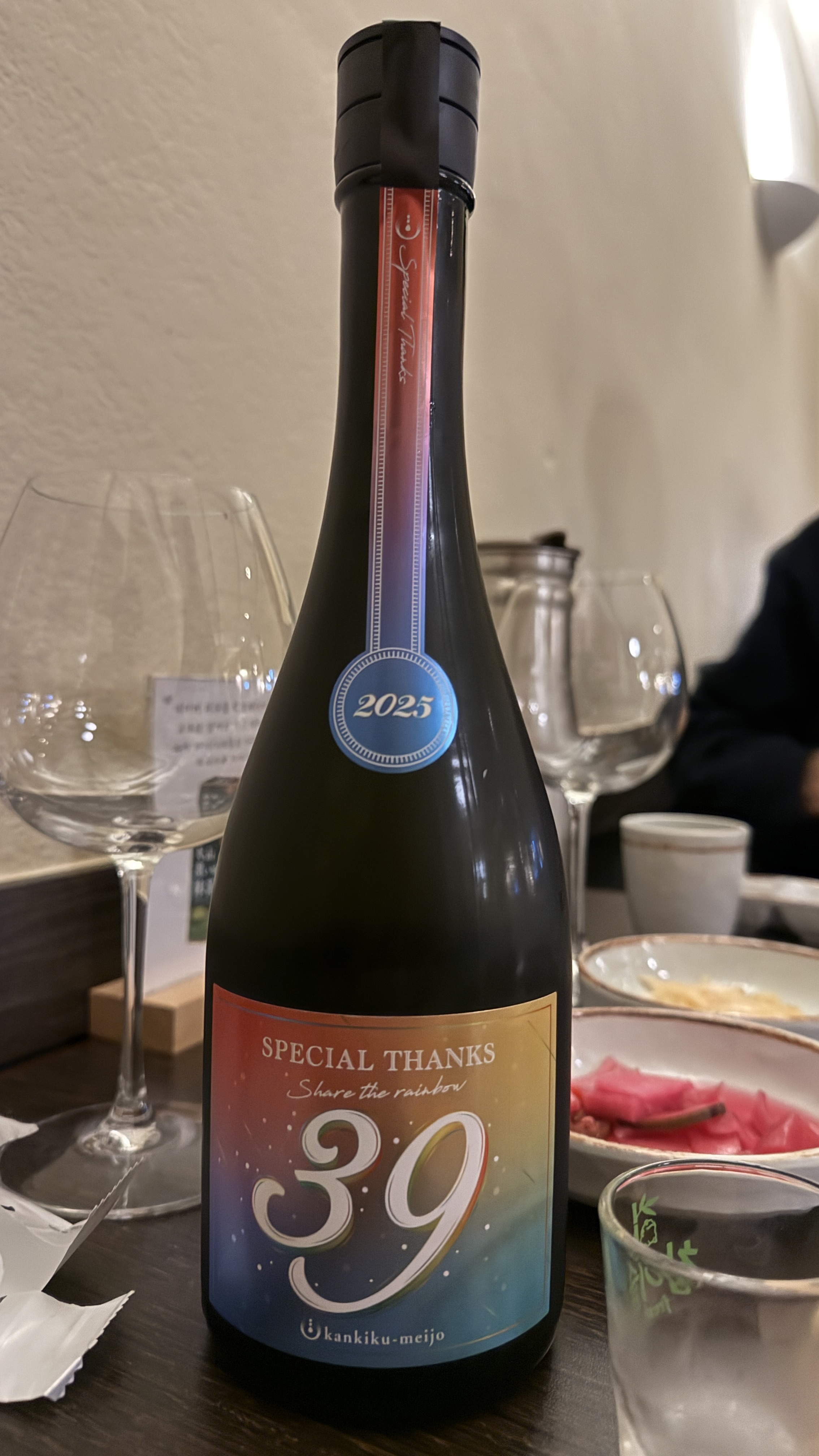 칸키쿠, 스페셜 땡스 쉐어 더 레인보우 39 2025(寒菊, Special Thanks Share the rainbow 39 2025). 일본어 발음으로 산큐인 39를 언어유희용으로 활용한 네이밍이다. 정미보합을 39로 맞추었으니 준마이다이긴조급 고급 사케이기도하고. 매년 연말 감사한 마음을 담아 만드는 한정판 사케다.