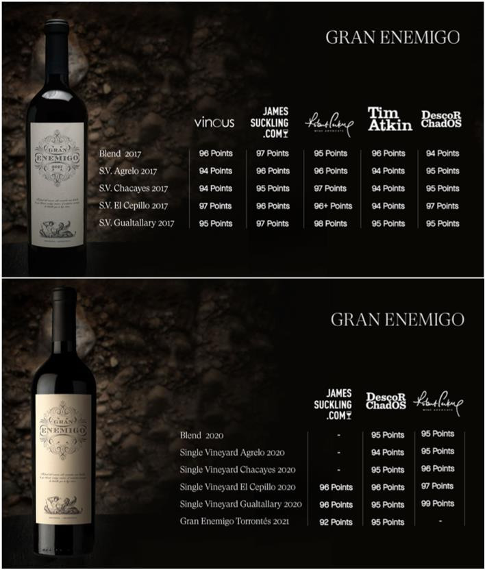그리고 이날의 메인 와인, 그랑 에네미고(Gran Enemigo) 싱글 빈야드 와인 2종을 시음했다. 두 와인의 생산 방식은 완전히 동일하다. 약 45일에 이르는 긴 수확 기간 동안 생리적으로 완숙한 포도만 엄선해 수확한다. 줄기를 제거하지 않은 포도송이를 일부 사용하며, 2~3번 사용한 프렌치 오크 배럴에서 배양 효모 첨가 없이 자연스럽게 발효한다. 숙성에는 100년 된 푸드르(foudre)를 사용해 오크 뉘앙스가 과하게 드러나지 않도록 유의한다. 사용한 포도 품종 또한 카베르네 프랑 85%, 말벡 15%로 동일하다. 그러니 두 와인의 차이는 온전히 테루아의 반영으로 만들어지는 셈이다.