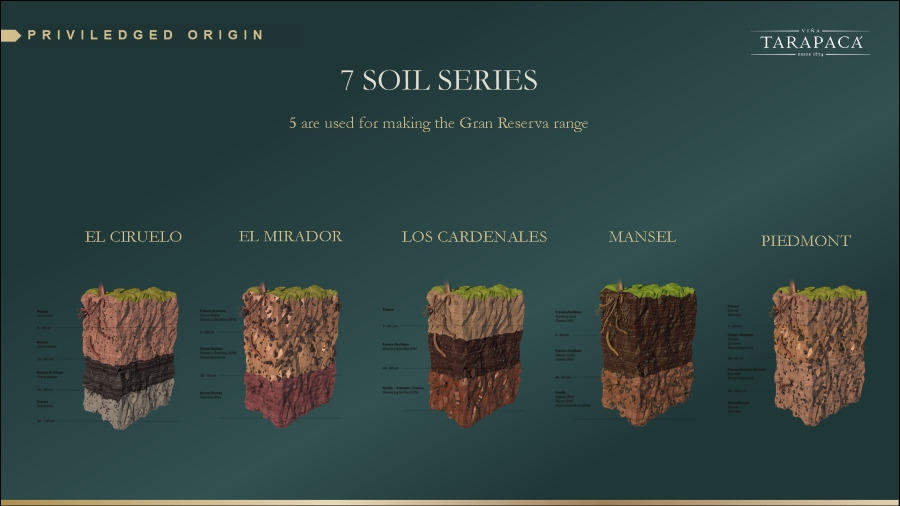 마이포 밸리의 심장부에 위치한 비냐 타라파카는 놀라울 정도록 독특한 테루아를 보유하고 있다. 위 이미지를 보면 알 수 있듯 포도밭의 사방이 산으로 둘러싸인 분지에 조성돼 있다. 그들은 이를 내추럴 클로(Natural Clos)라고 부른다. 클로(clos)는 프랑스 와인 산지에서 담으로 둘러싸인 최고의 포도밭에 사용하는 표현이다. 주변의 산이 돌담처럼 포도밭을 둘러싸고 있는 모습이 클로를 연상시킨다며 이렇게 부르는 것이다. 토양은 화산토, 화강암, 그리고 석회질 등 세 가지가 주를 이룬다. 위쪽으로 보이는 안데스 산맥에는 화산토, 왼쪽의 마이포 강 주변에는 화강암, 아래 부근에는 석회암 토양이 주로 분포한다. 세부 구획의 토양을 좀 더 명확히 확인하기 위해 오랜 연구를 진행했으며, 이를 위해 파내려 간 구덩이만 해도 373개에 이른다. 이를 통해 토양 타입을 크게 일곱 가지로 분류했다. 그중 다섯 가지 토양에서 재배한 포도는 그랑 리제르바(Gran Reserva) 와인을 만드는 데 사용한다. 포도밭의 경사도와 일조량 또한 다양하다. 같은 토양이라도 5% 경사도와 20% 경사도에서 생산하는 포도는 그 풍미가 확연히 다르기 때문에 다양한 스타일의 와인을 만드는 데 도움이 된다.