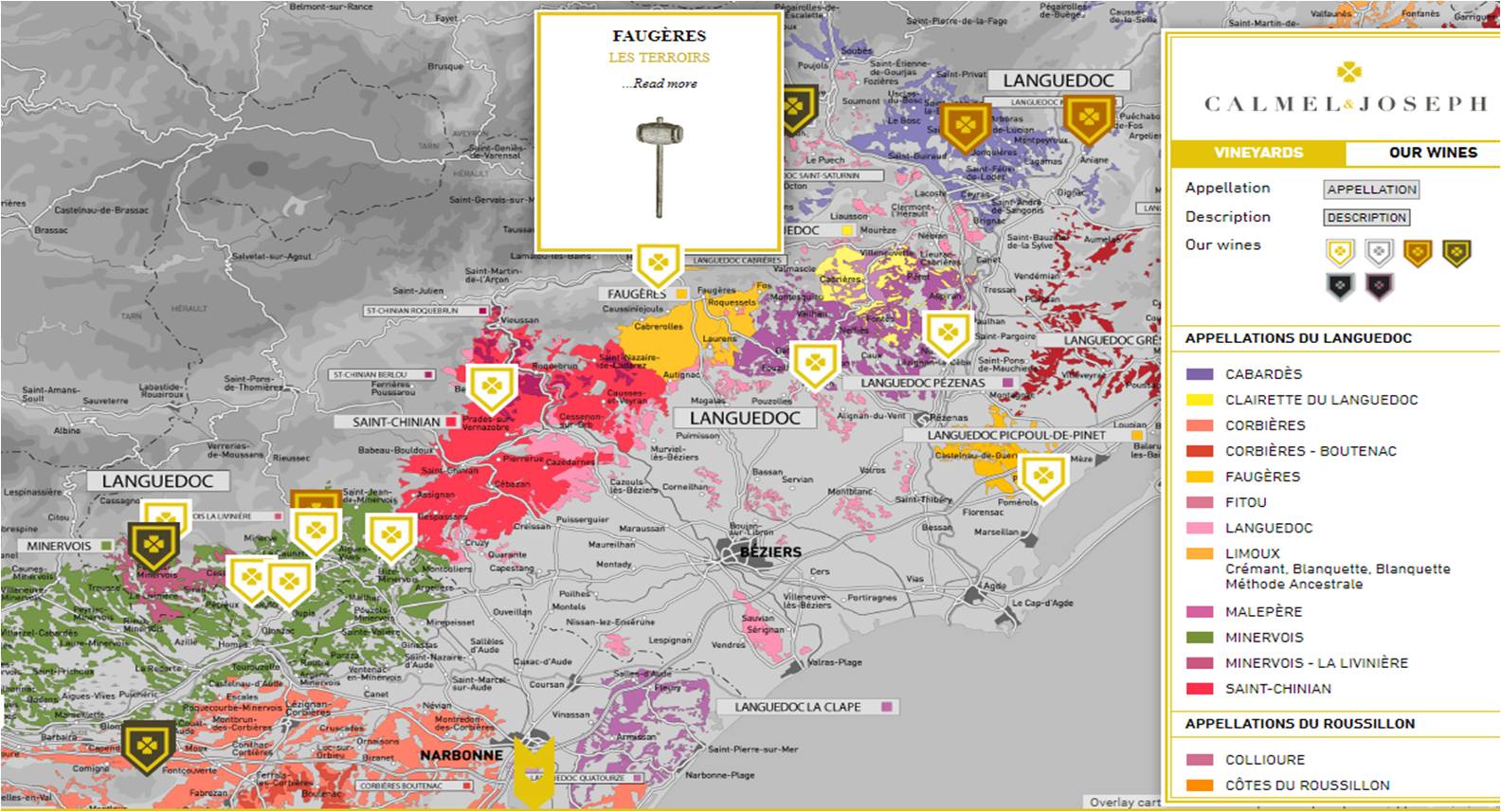 레 테루아 시리즈는 랑그독-루시옹의 주요 지역 별 와인들로 구성되어 있다. 내가 좋아하는 포제르(Faugeres)와 생 시니앙(Saint-Chinian)은 물론 미네르부아(Minervois), 코르비에르(Corbieres), 꼬뜨 뒤 루시옹 빌라주(Cotes du Roussillon Villages) 등 주요 AOC(AOP)들이 총망라되어 있다. 단 하나, 비유 카리냥(Vieux Carignan)은 꼬뜨 뒤 브리앙(Cotes du Brian IGP)인데, AOC는 아니지만 120년이 넘은 올드 바인 까리냥이 드러내는 떼루아를 표현하기 위해 까리냥 100%로 양조한 와인인 듯.