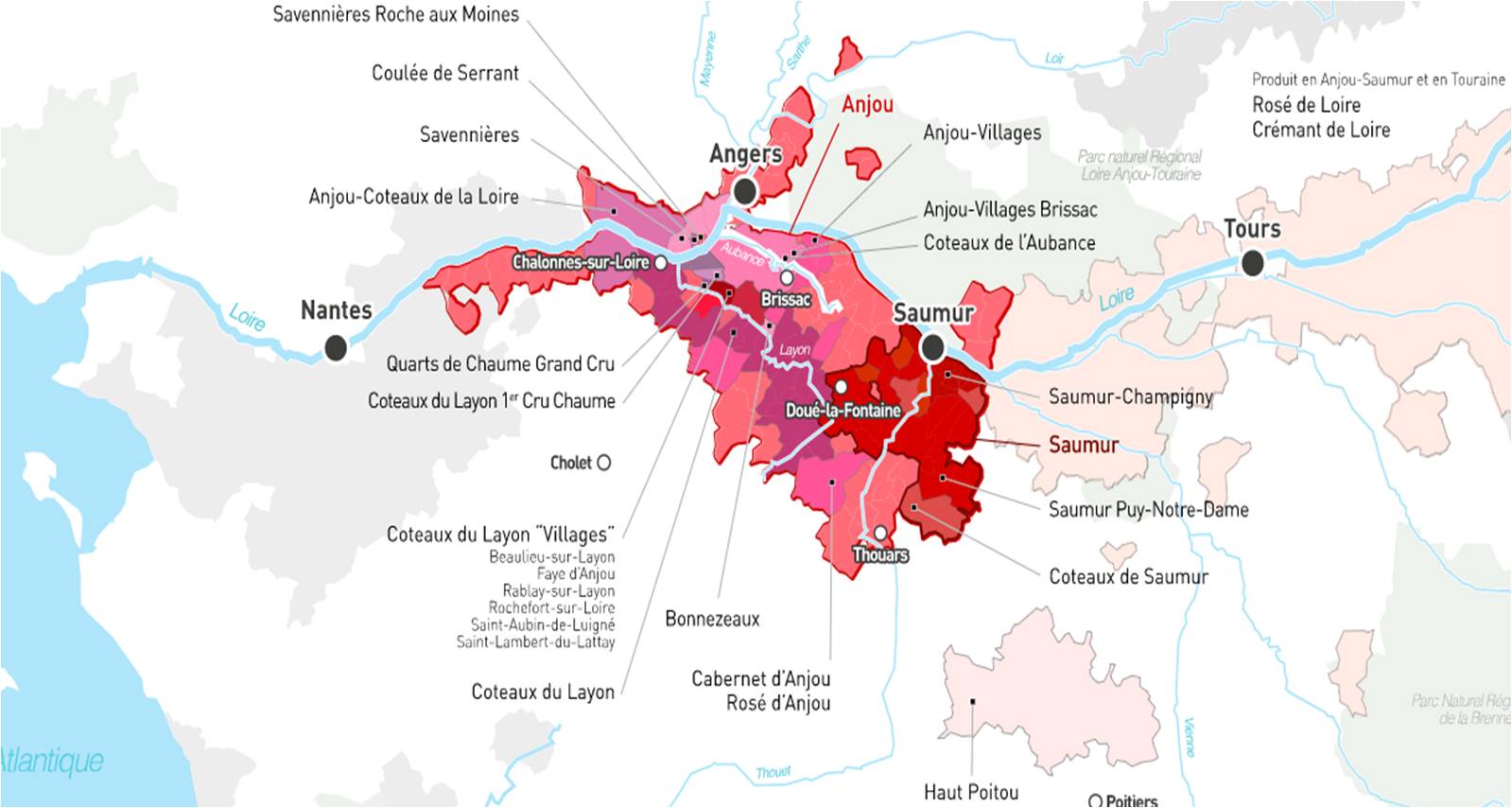 스위트 와인을 생산하는 지역은 대부분 루아르 중부 지역인 앙주 소뮈르(Anjou Saumur)에 몰려 있다. 가장 큰 AOC이며 전체를 포괄하는 꼬또 뒤 레이용(Coteaux du Layon)이 있다. 꼬또 뒤 레이용 안에는 빌라주명을 붙여 출시할 수 있는 수 있는 여섯 개 마을이 있으며, 프리미에 크뤼로 인정 받는 숌므(Coteaux du Layon 1er Cru Chaume), 그리고 그랑 크뤼 콰츠 드 숌므(Grand Cru Quarts de Chaume)와 본느조(Bonnezeaux)가 있다. (※ Layon의 발음은 레용에 더 가까운 것 같은데 한국에서는 대부분 레이용이라고 표기하므로 그대로 따랐다.)