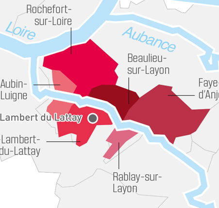 왼쪽이 꼬또 뒤 레이용, 오른쪽은 빌라주 명칭을 붙일 수 있는 6개 마을의 지도다. 주로 레용 강을 사이에 두고 루아르 강과 레용 강이 만나는 부근에 몰려 있다. 6개 마을의 이름은 보리유 쉬르 레이용(Beaulieu-sur-Layon), 파예 당주(Faye-d’Anjou), 라블레 수르 레이용(Rablay-sur-Layon), 로슈포르 쉬를 루아르(Rochefort-sur-Loire), 생또방 드 뤼지네(Saint-Aubin-de-Luigné), 생 람베르 뒤 라테(Saint-Lambert-du-Lattay).