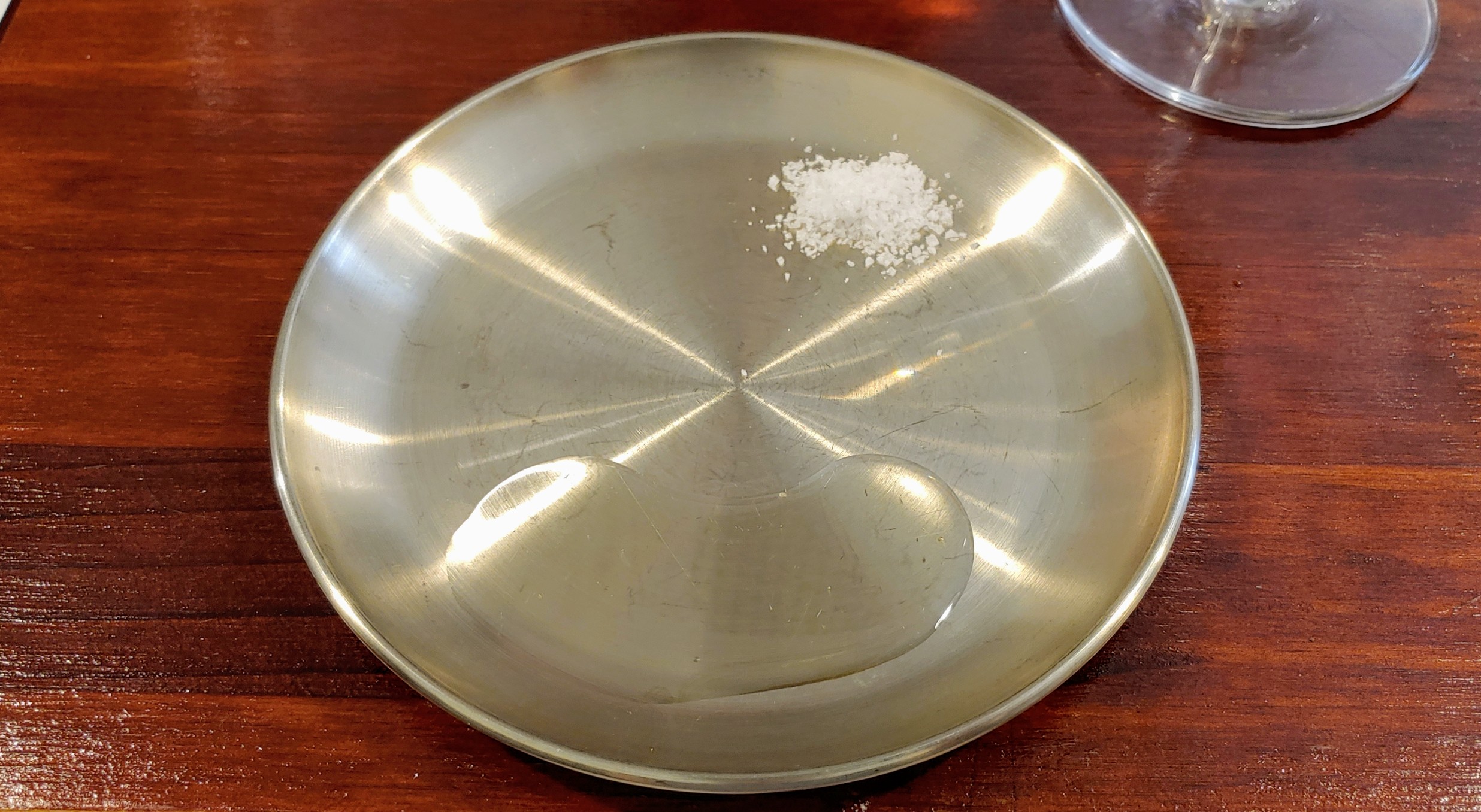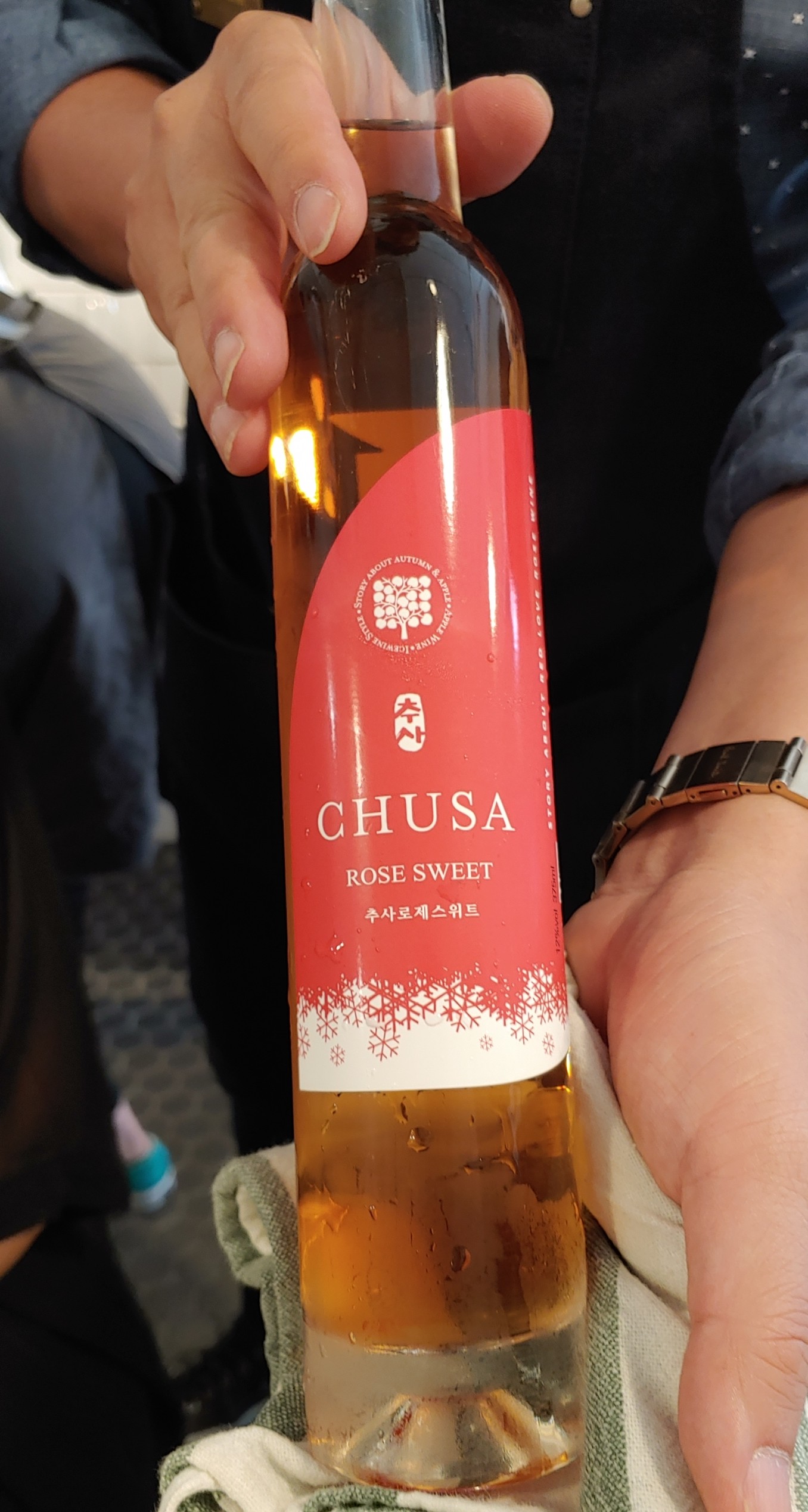 곁들인 와인은 충남 예산사과와인의 '추사 로제 스위트'. 레드 러브라는 속까지 붉은 사과 품종으로 만들어 와인의 컬러가 반짝반짝 영롱한 붉은 구릿빛이다. 새콤달콤한 사과향, 가벼운 쌉쌀함과 수렴성이 스치는 첫인상 이후 달콤한 사과꿀 풍미가 느껴진다. 심플하지만 깔끔하고 날 선 느낌. 추사 선생의 기품을 반영한?