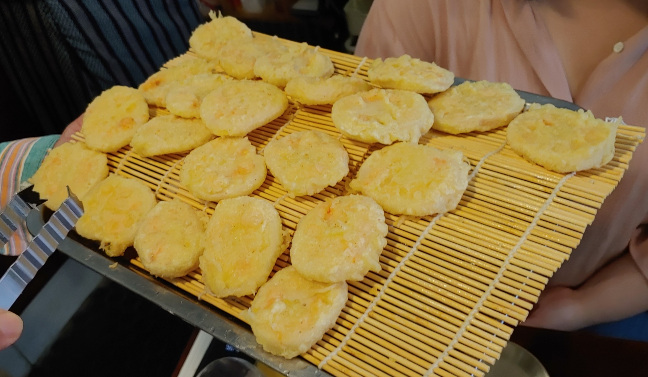 튀김의 마무리로 관자를 넣은 야채튀김.