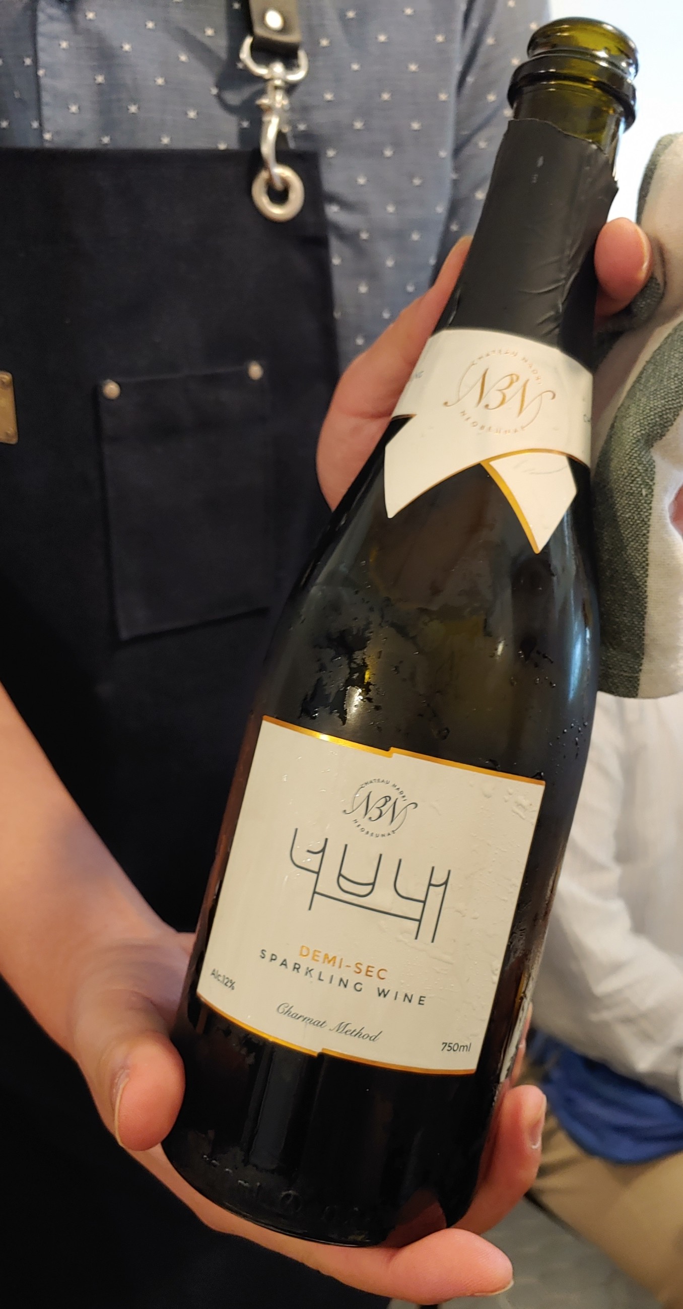 튀김엔 역시 스파클링이라며 등장한 와인. 강원도 홍천 샤또 나드리의 '너브내 스파클링 드미 섹 화이트'. 물파스같이 화한 허브향에 청귤, 라임 같이 싱그럽고 상쾌한 아로마. 거품은 조금 거칠고 성근 편이지만 달지 않은 사과의 깔끔한 맛이 개운하다.