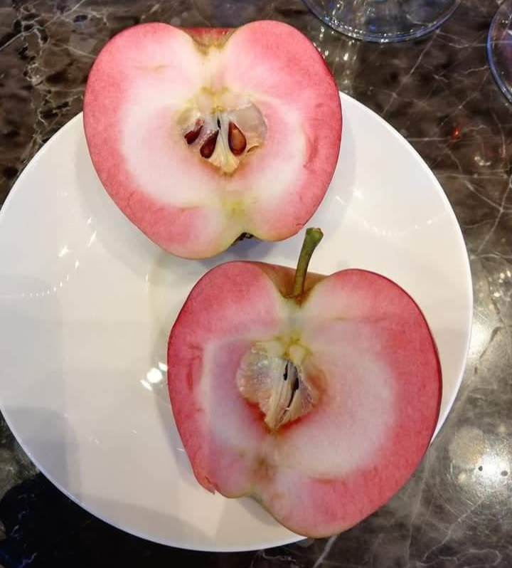 반으로 가른 레드 러브 품종. 껍질 뿐만 아니라 속도 붉은빛을 띠기 때문에 술을 담그면 영롱한 붉은빛을 띤다. 그것이 바로 추사 로제의 컬러가 된 것. 이런 품종으로 와인을 만들 생각을 하시다니, 정말 대단하다. 사과 자체는 먹기에 조금 질긴 편이고 산미가 강하다고. 하지만 워낙 예쁘다보니 어떻게든 모양을 살려 먹어 보고 싶기도 하다.