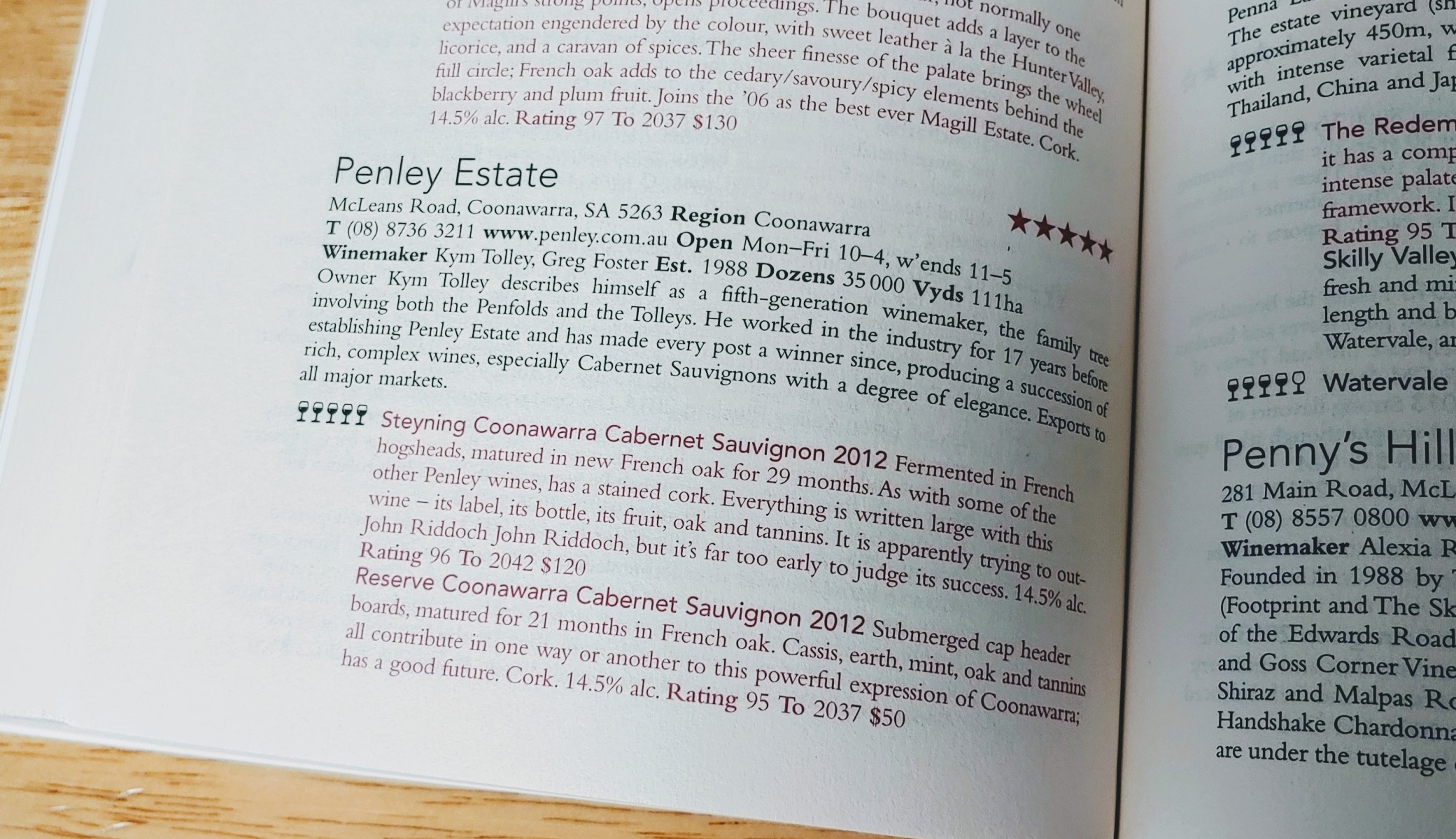 펜리 이스테이트 소개에 붉은 별 5개가 붙어 있다(2016년 기준). 3년 이상 95점 이상 평가를 받은 와인이 2개 이상이어야 받을 수 있는 등급으로 호주 와이너리 중 10% 정도만 이에 해당된다.