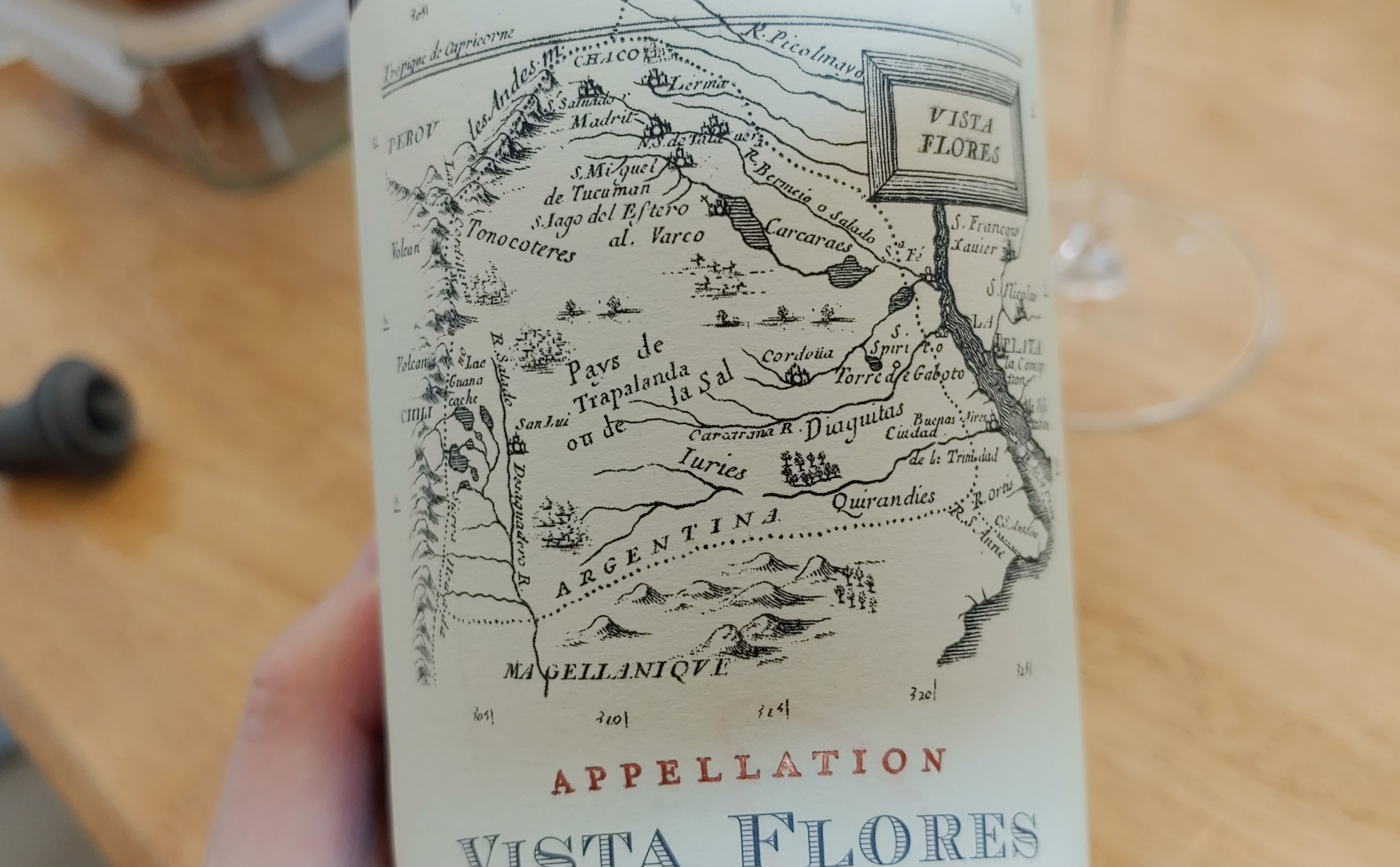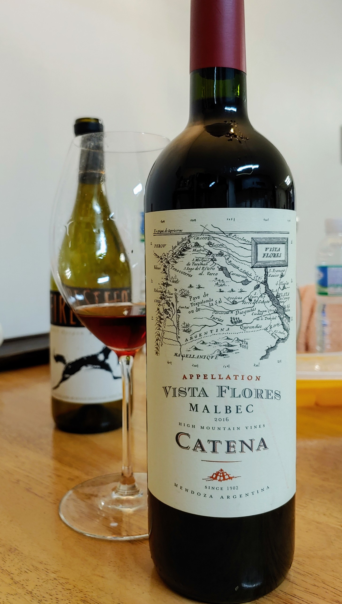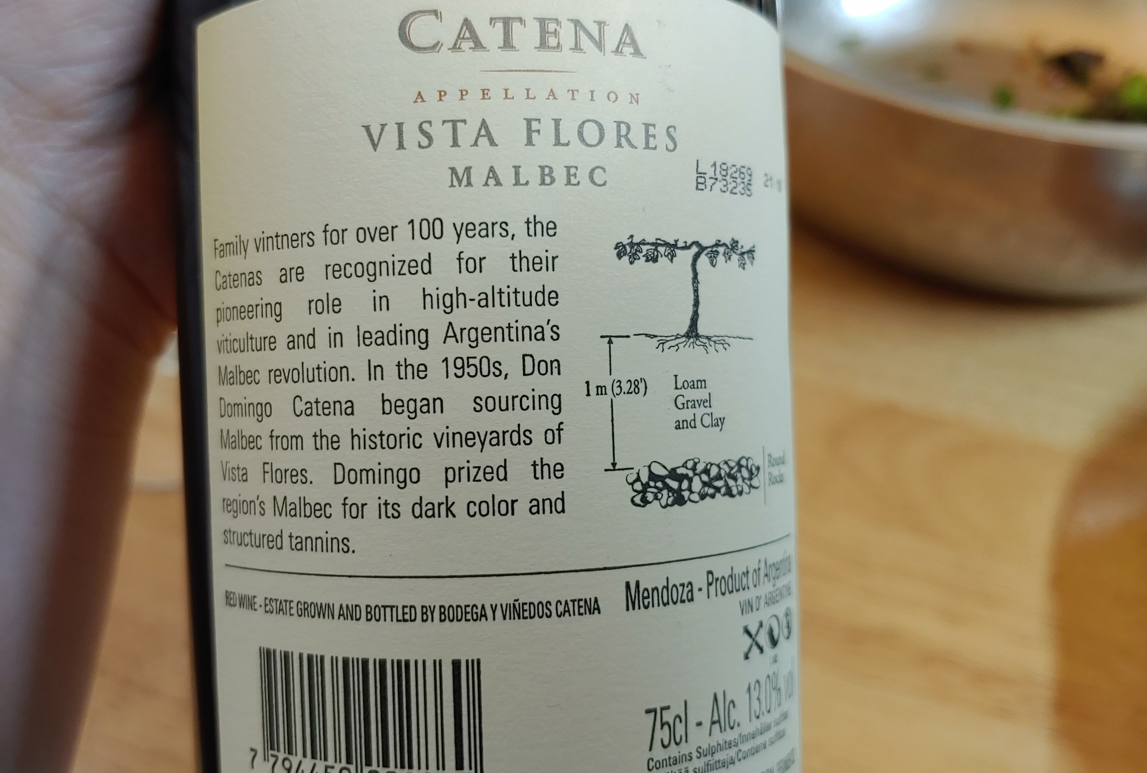 애정하는 생산자 카테나(Catena)의 와인. '어펠레이션 비스타 플로레스(Appellation Vista Flores)'라는, 생산 지역에 방점이 찍힌 레이블인데 'High Mountain Vines'라는 표현이 지역 특징을 강하게 드러낸다.