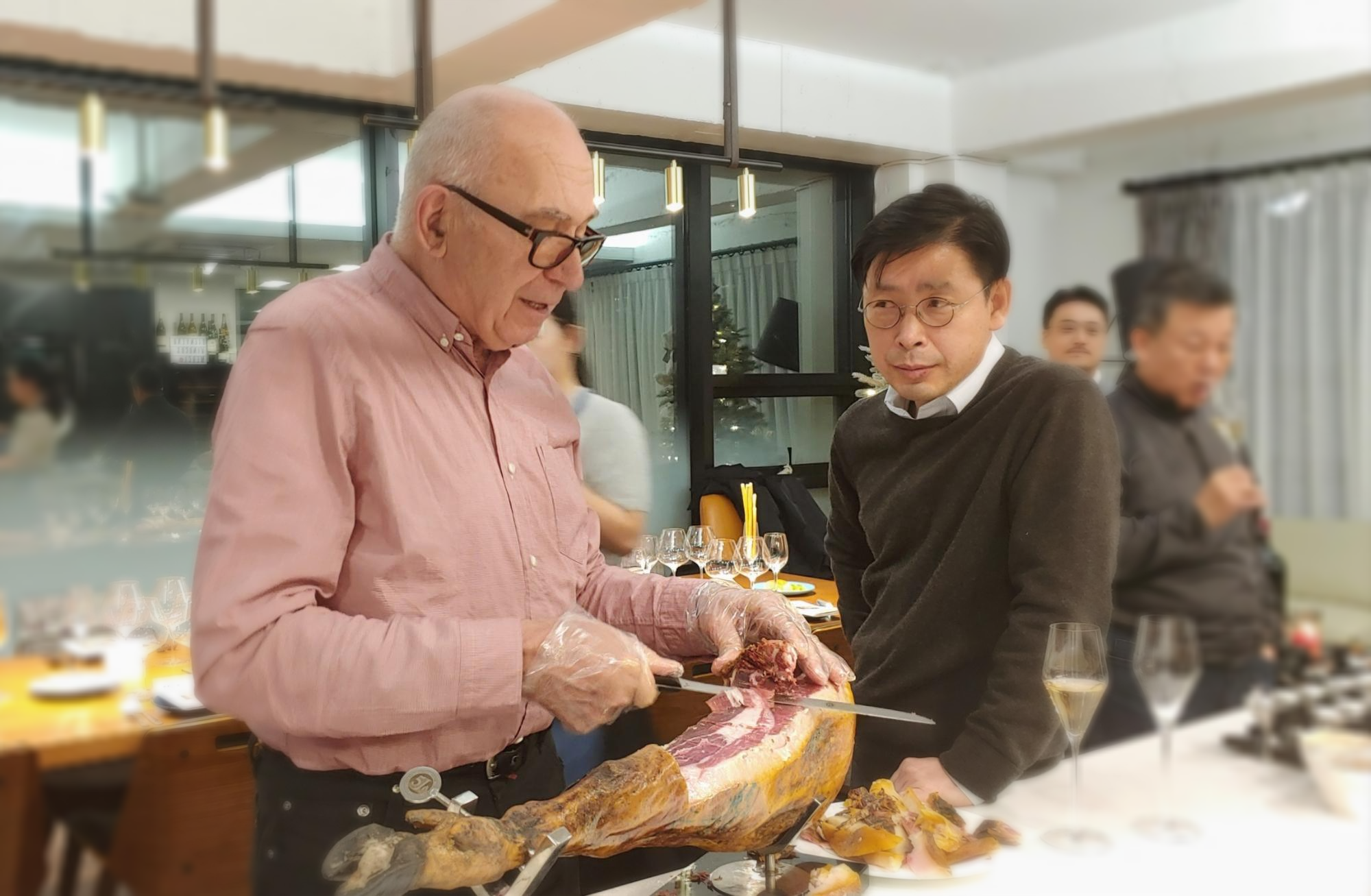디너 시간에 맞춰 도착했는데 샤토 몽투스의 오너이자 와인메이커 알랭 브루몽(Alain Brumont) 씨가 직접 하몽을 썰고 있었다. 오른쪽은 비노쿠스 최신덕 대표님.