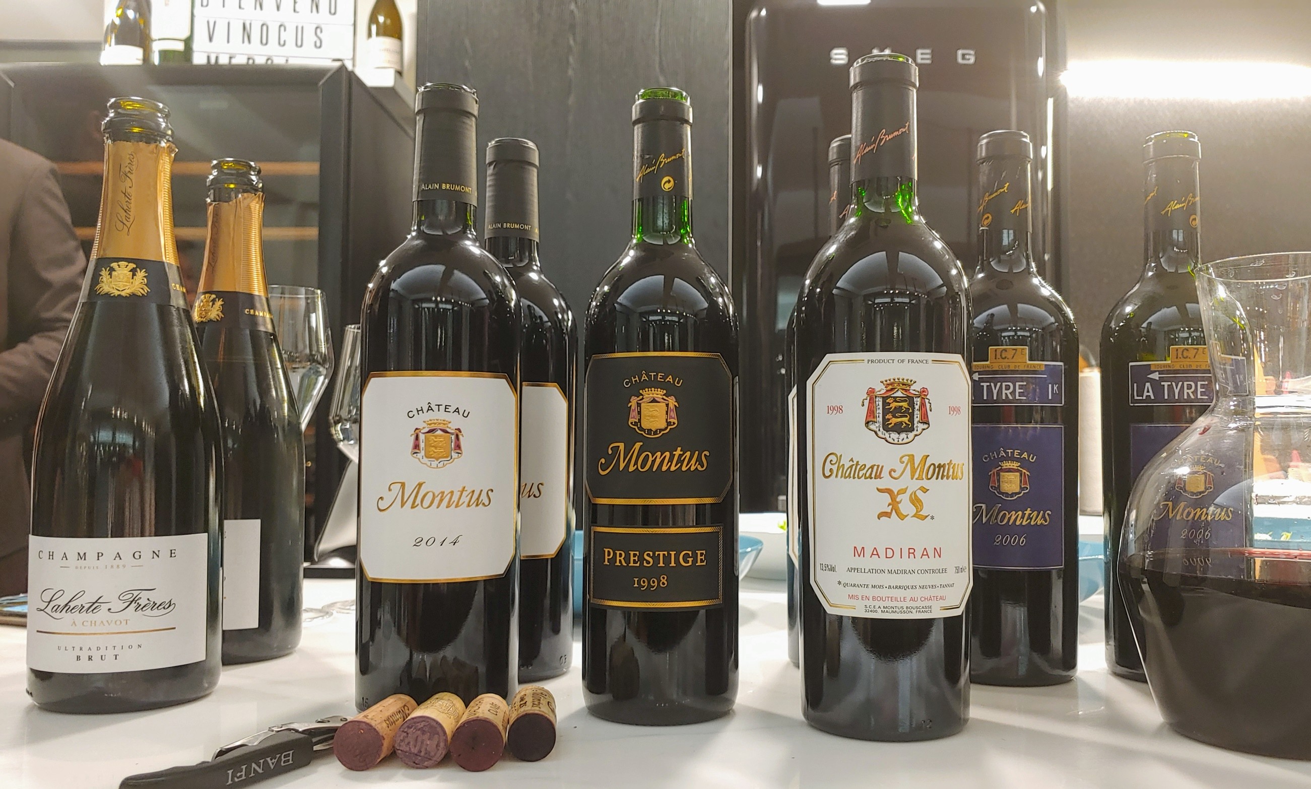 도열한 와인들. 몽투스의 모든 라인업이 출동했다(몽투스 블랑은 칠링 중). 아이콘 와인 라 티르(La Tyre)는 미리 디캔팅을 해 두셨다. (Banfi는 뭐지...)