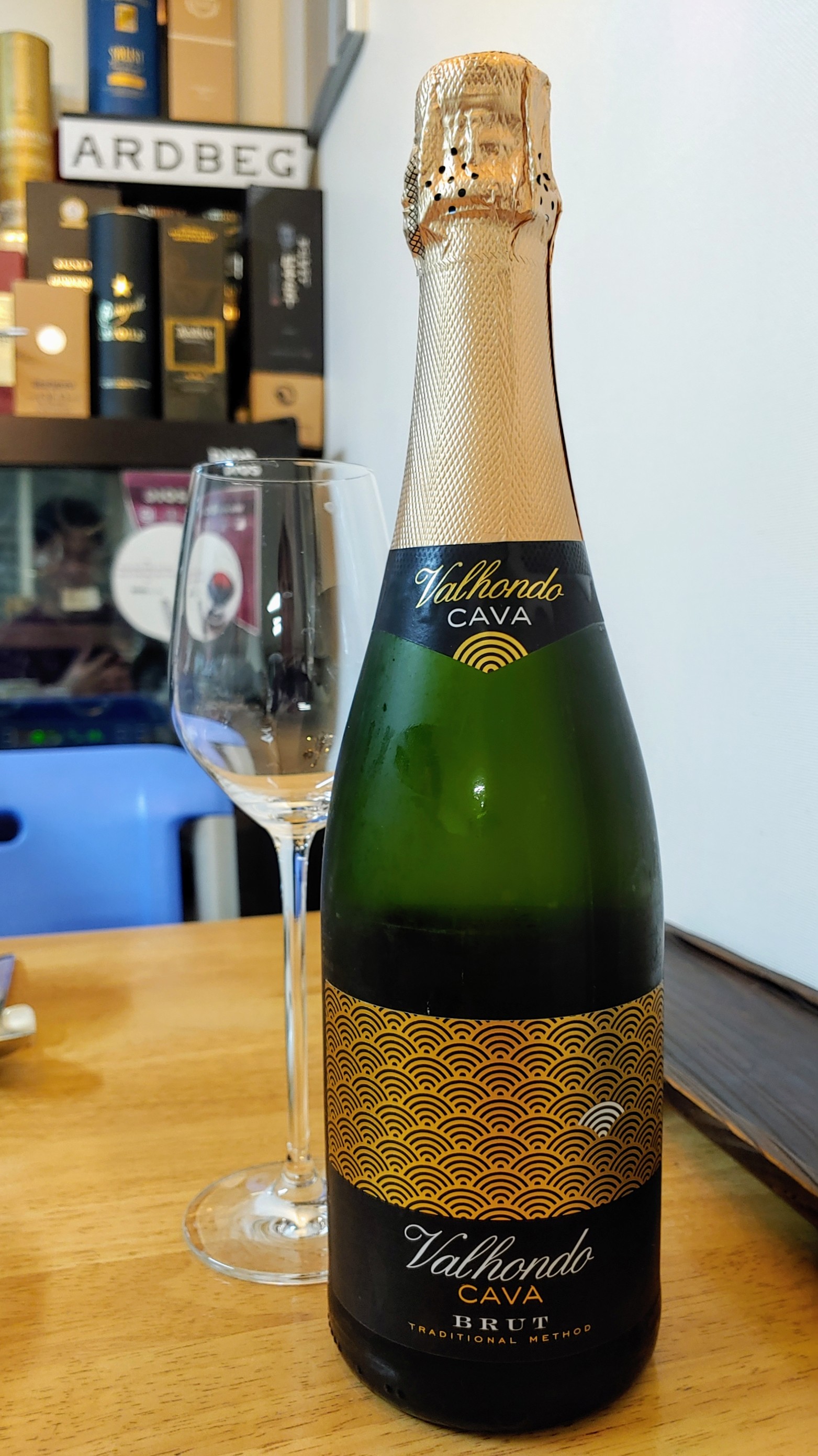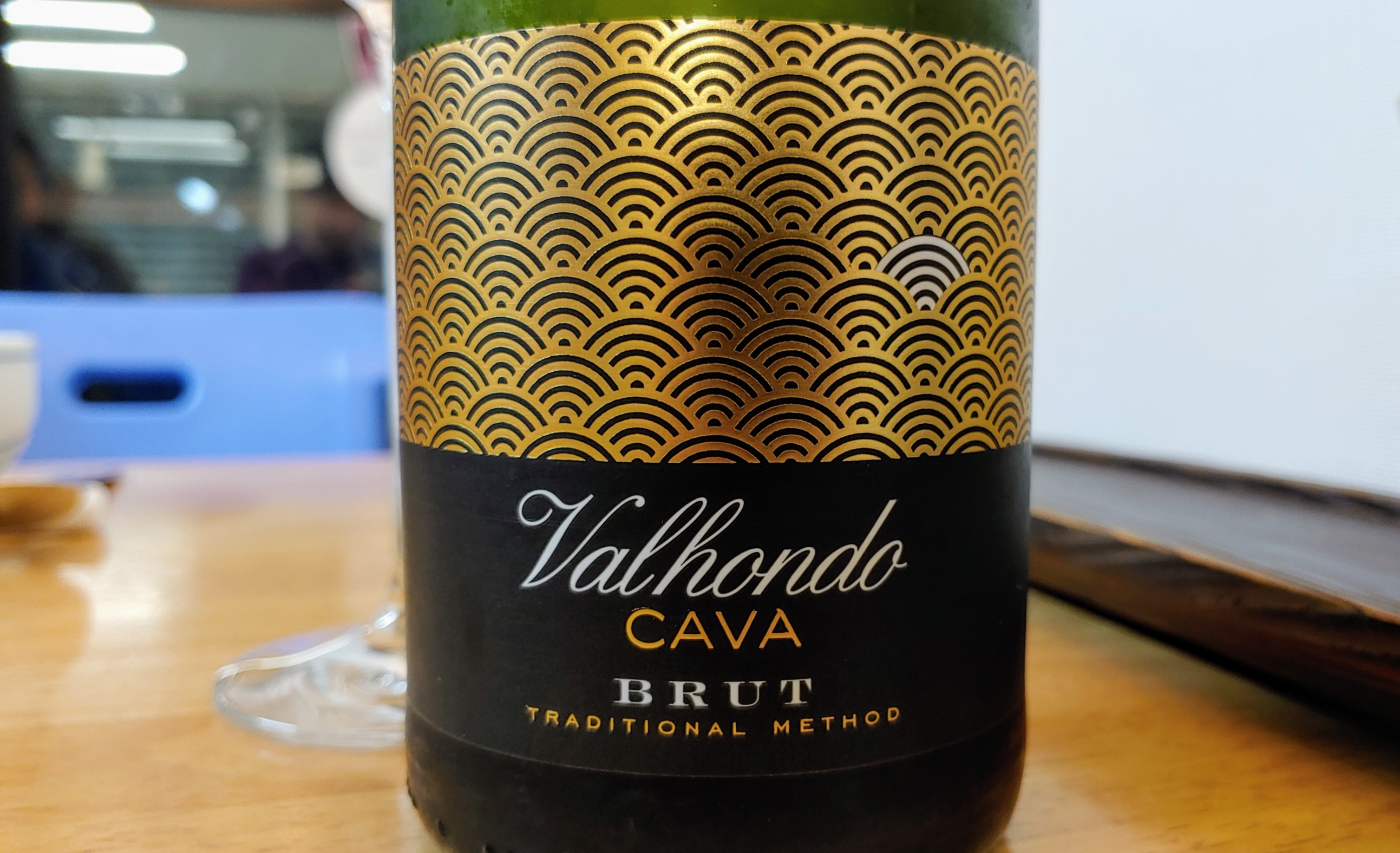 발혼도 카바 브뤼(Valhondo Cava Brut). 레이블이 마치 금빛 파도를 형상화한 것 같기도 하고, 부채들을 겹쳐서 펼쳐 놓은 것 같기도 하다. 사실은 와이파이의 천국 같... 그런데 흰색인 와이파이 하나는 신호가 약한 건가ㅋㅋㅋㅋ;;;