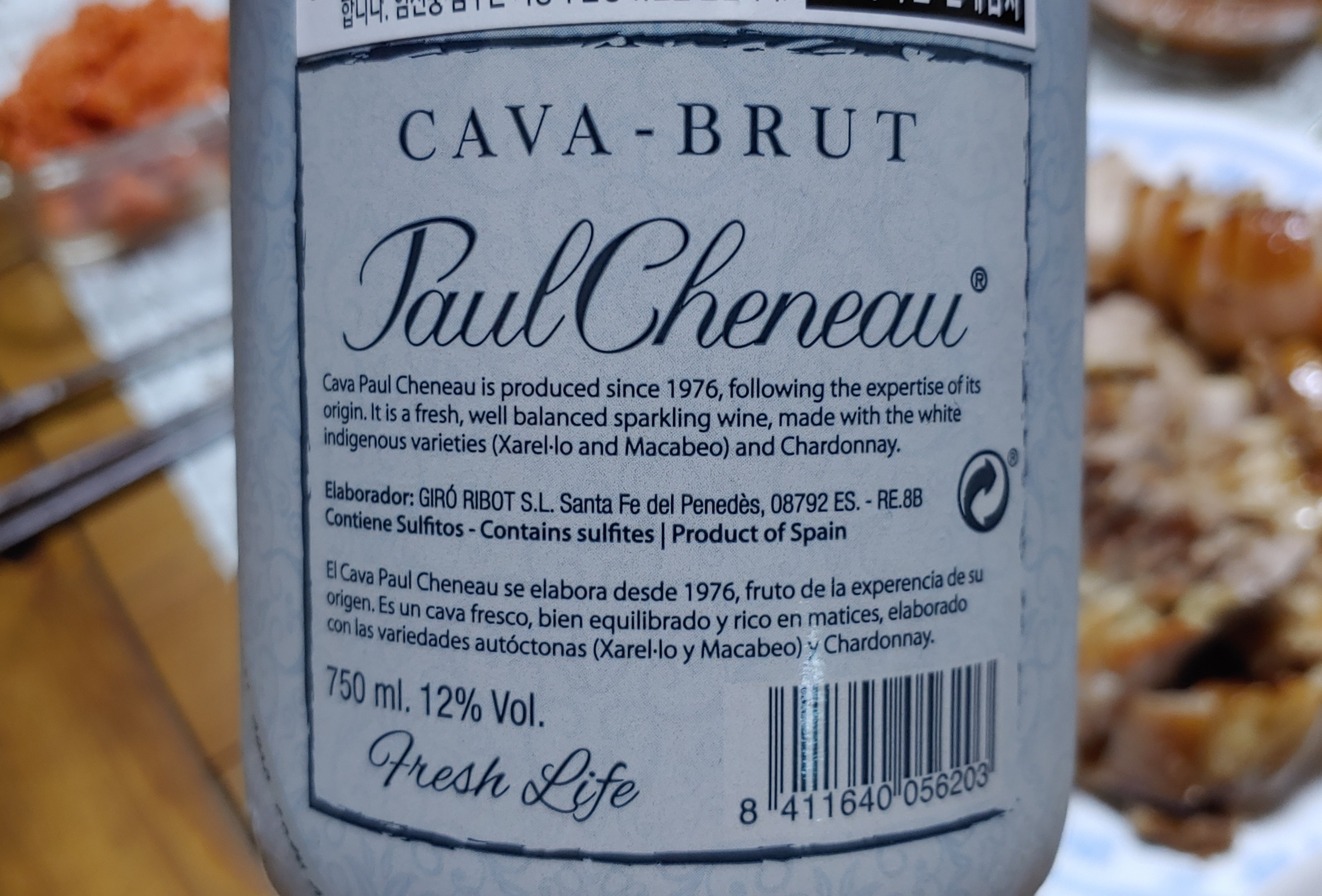 백 레이블의 간략한 소개. 폴 쉐노는 1976년부터 생산되었으며, 자렐로, 마카베오, 그리고 샤르도네를 블렌딩한 블랑 드 블랑 까바라고 한다. 그런데 화이트 까바는 대부분 블랑 드 블랑 아니었던가...
