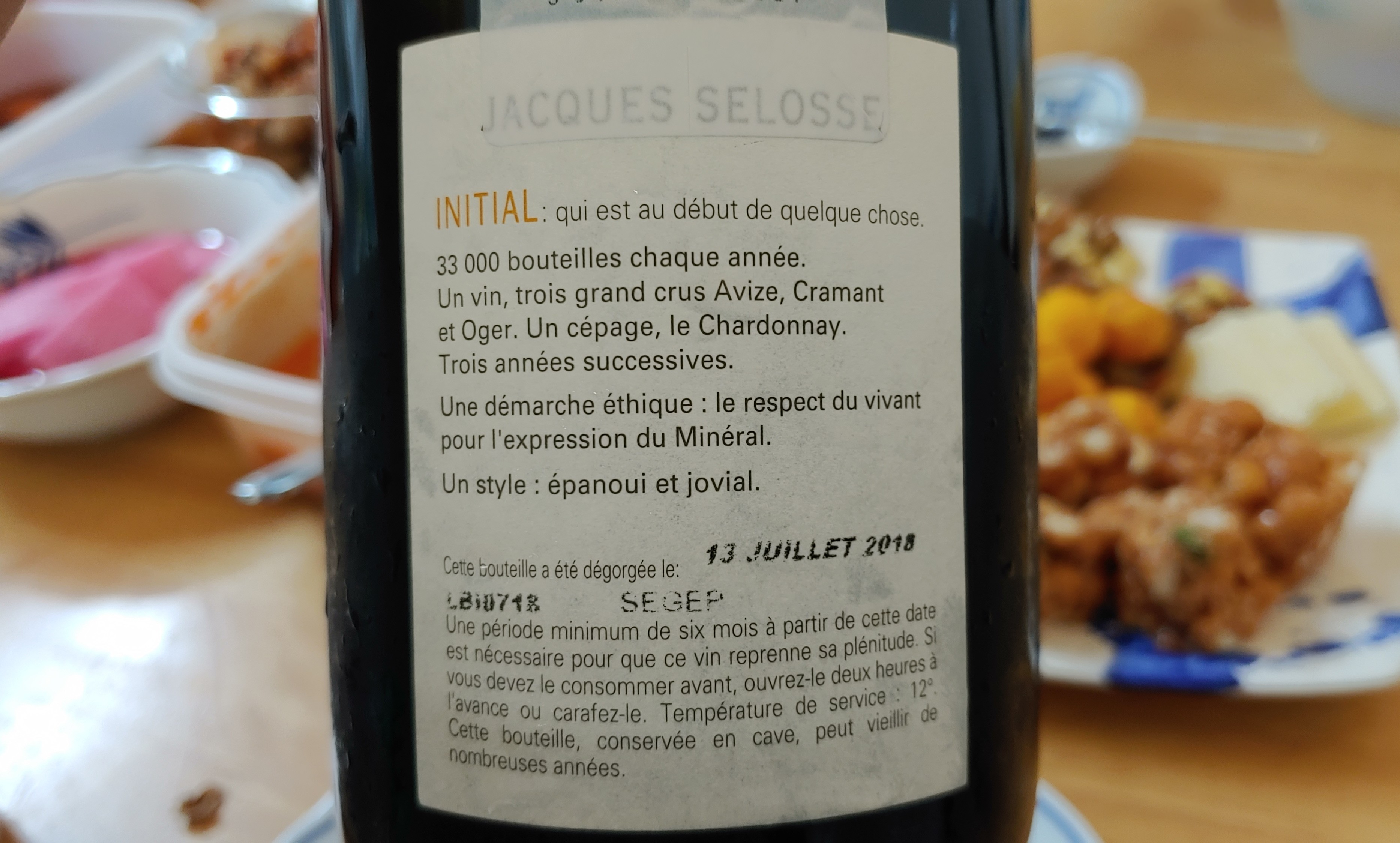 이니셜은 꼬뜨 데 블랑(Cote des Blancs)의 그랑 크뤼인 아비즈(Avize), 크라망(Cramant), 오제(Oger)에서 재배한 샤르도네로 양조한 자크 셀로스의 엔트리급 샴페인이다. 이어지는 3년 동안 수확한 포도로 만들며 연 33,000병 생산한다. 데고르주망 일자는 2018년 7월 13일로 최소 6개월 후에 음용할 것을 권장하고 있다. 만약 먼저 마셔야 한다면 2시간 전에 오픈하거나 디캔팅을 하란다. 미네랄이 도드라지는 힘차고 쾌활한 스타일이라고.