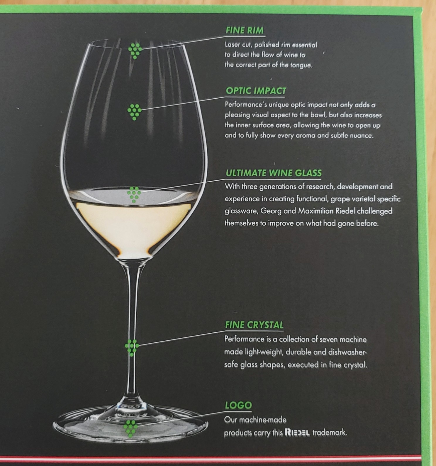 잔의 부분 별 기능 소개... 인 척 하는 자랑질. 눈여겨 볼 부분은 역시 옵틱 임팩트(Optic Impact). 미적으로 아름다운 모습을 구현함과 동시에 안의 접촉 면적을 넓혀서 와인의 아로마와 섬세한 뉘앙스를 활짝 피어나게 만든다고.