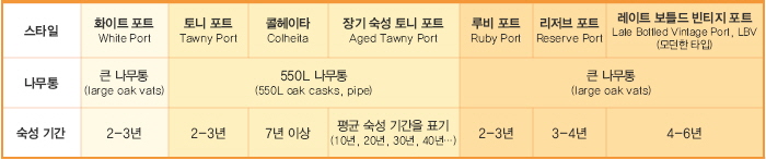 일반 루비 포트(Ruby Port)와 토니 포트(Tawny Port)는 사실상 거의 유사한 스타일이다. 둘 다 나무통에서 2-3년 정도 숙성해서 출시하는데, 토니 포트는 보통 작은 나무통(종종 pipe라고 부르는 550리터 오크통)에, 루비 포트는 커다란 나무통에 숙성한다는 차이가 있을 뿐. 그래서 루비 포트는 토니 포트에 비해 좀 더 붉은 루비 빛을 띄고 과일 풍미 또한 조금 더 드러나는 경향이 있다.