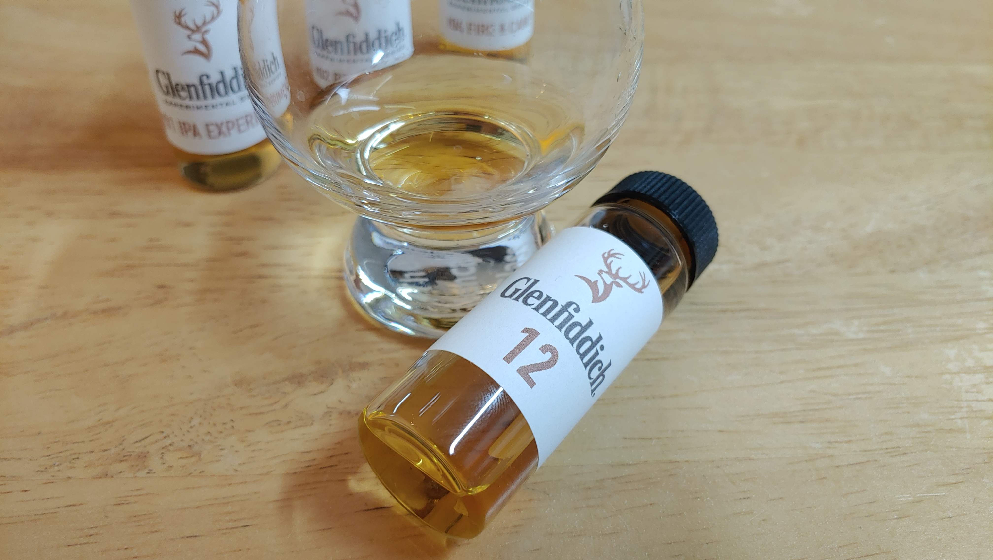 시음용으로 바이알 병에 담겨 온 위스키는 총 네 가지입니다. 3종의 익스페리멘탈 시리즈와 글렌피딕 12년 숙성(Glenfiddich 12 Years Old)이 함께 왔네요. 아마도 12 yo는 비교군의 역할이겠죠. 출제자(?)의 의도에 맞게 맛의 기준점을 세운다는 면에서 12년 숙성부터 맛을 보았습니다. 노징 글라스는 시음 내내 글렌캐런(Glencairn)을 썼고요.