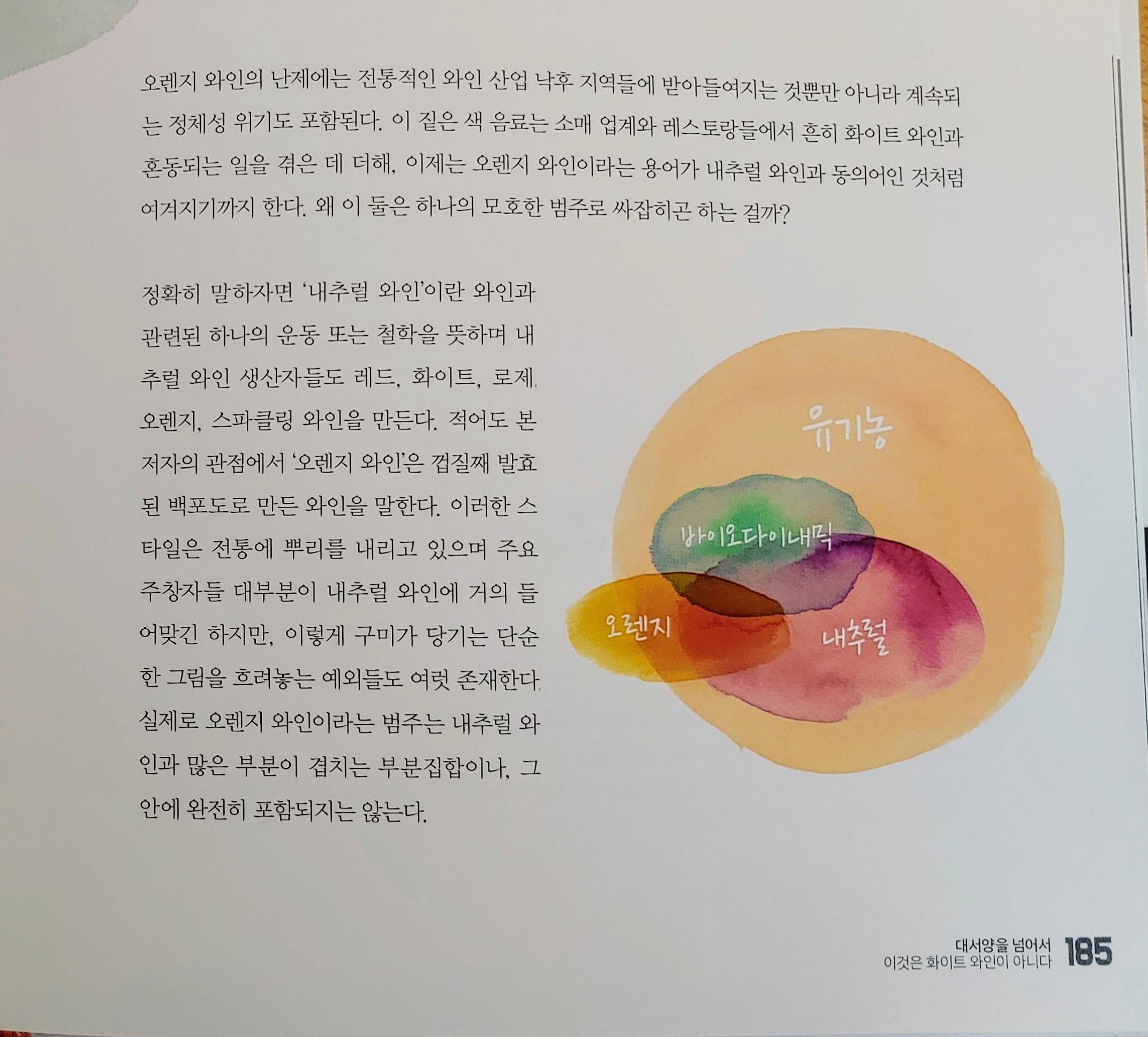 참고로 오렌지 와인과 내추럴 와인은 그 카테고리가 아예 다르다. 오렌지 와인은 내추럴 와인일 수도 아닐 수도 있다. <앰버 레볼루션>의 본문 중 아래 두 페이지를 보면 그 관계를 명확히 이해할 수 있을 것이다.