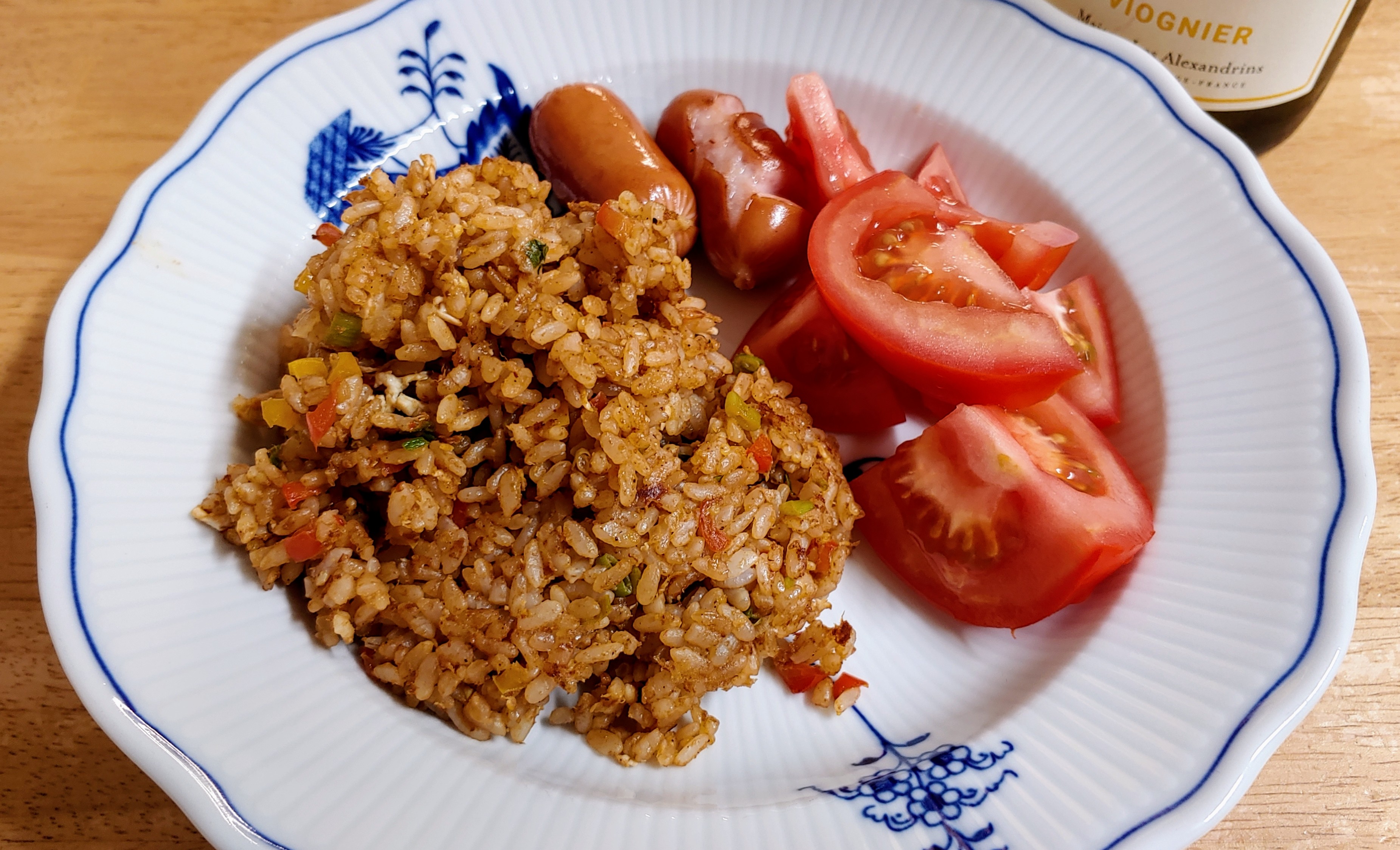 소시지와 토마토를 곁들인 나시고랭. '스파이시 아시안 푸드' 하니 떠오르는 와인이 있었다.