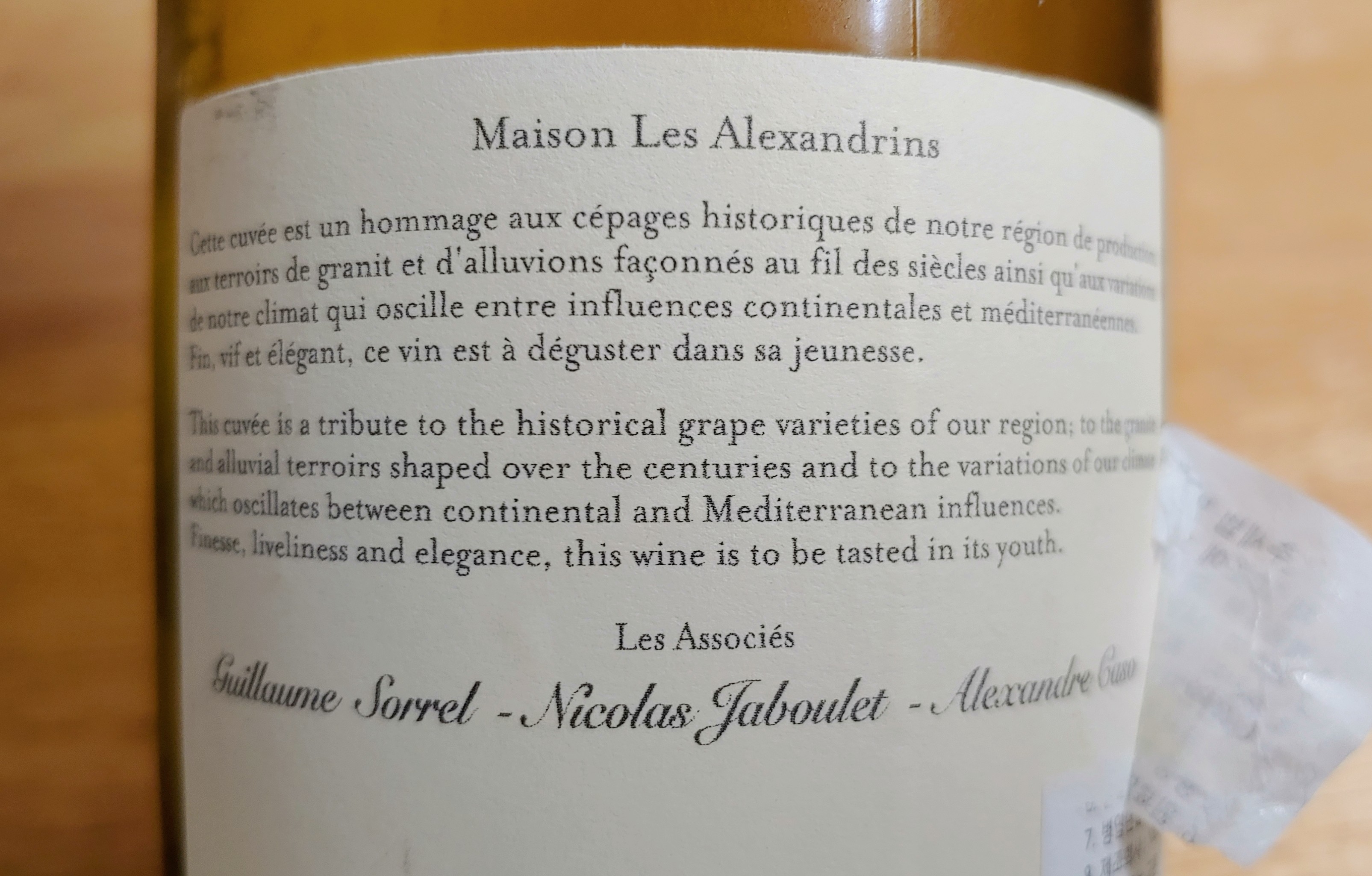 생산자는 알렉산드린(Alexandrins). 처음 보는 메종(Maison)이다. 그런데 백 레이블 아래 눈에 띄는 이름들이 보인다.