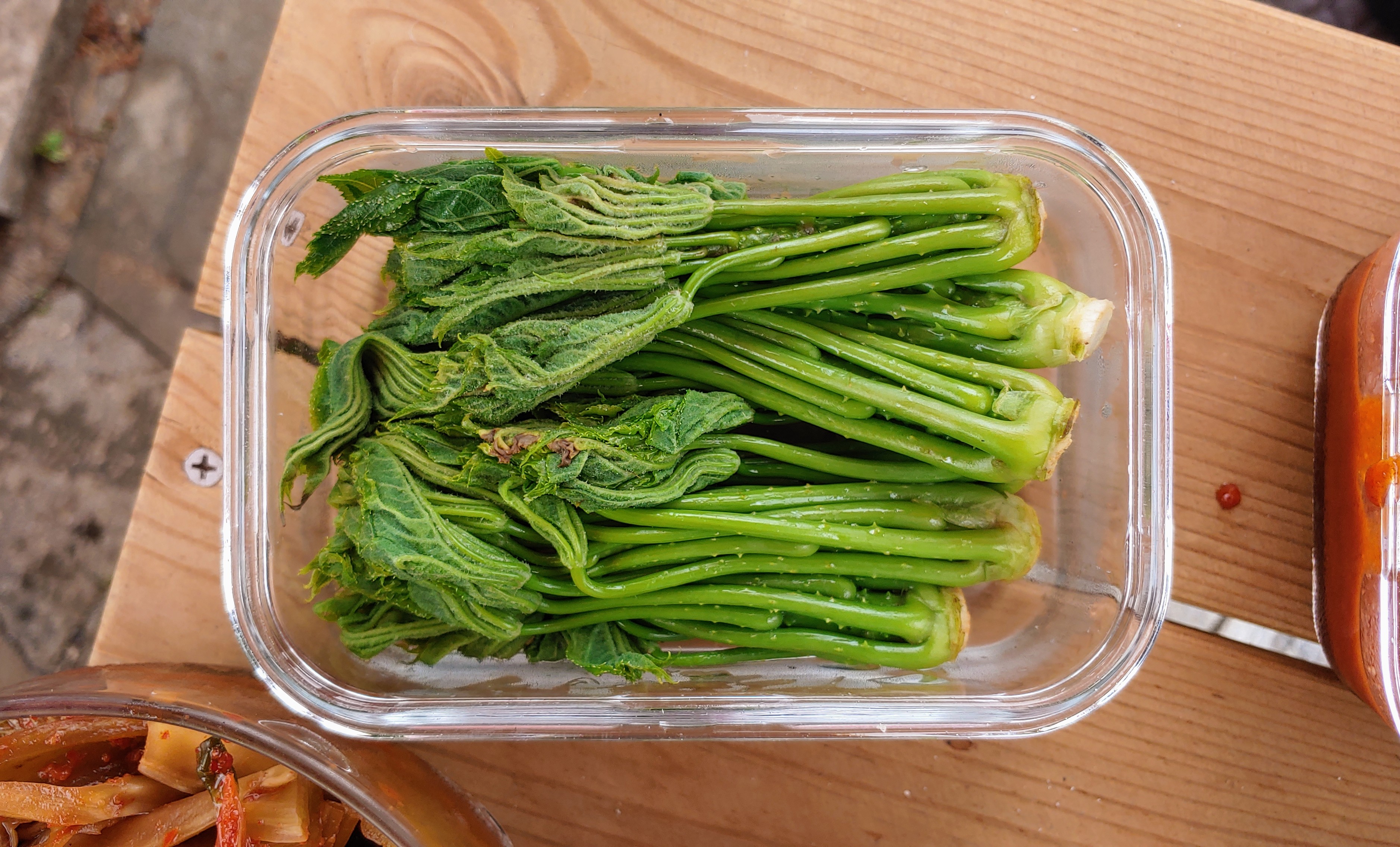 진귀한(?) 것들도 있어요. 아버지가 직접 키우신 엄나무에서 딴 엄나무순입니다. 두릅이랑 비슷하게 생겼죠? 지난번에 왔을 땐 두릅도 있었는데, 그건 이제 너무 자랐다고 하네요.