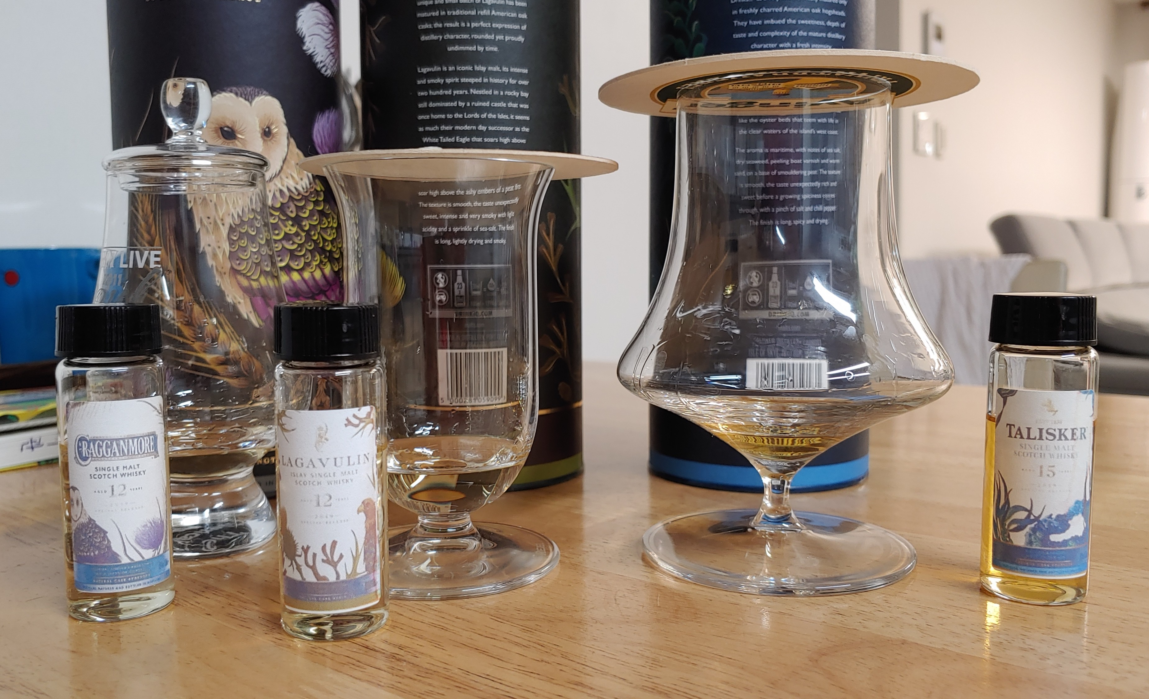 생각나는 노징 글라스 5종을 꺼내서 어울릴 것 같은 위스키에 임의로 매칭. 글라스 이름은 좌로부터 글렌 캐런, 리델 비늄 싱글 몰트, 슈피겔라우 빌스베르거 애니버서리 위스키, 리델 베리타스 스피릿, 리델 퍼포먼스 스피릿 글라스.