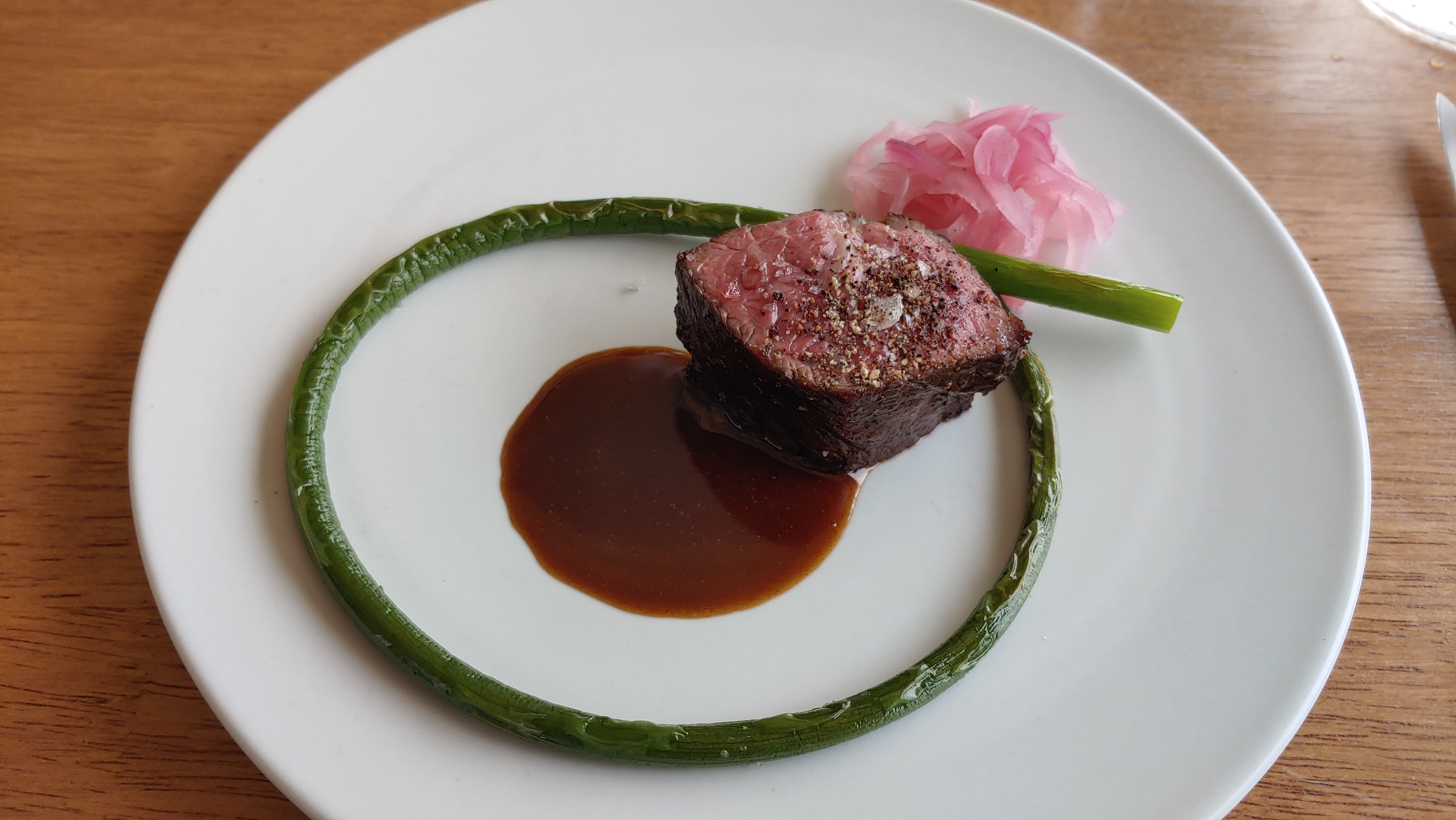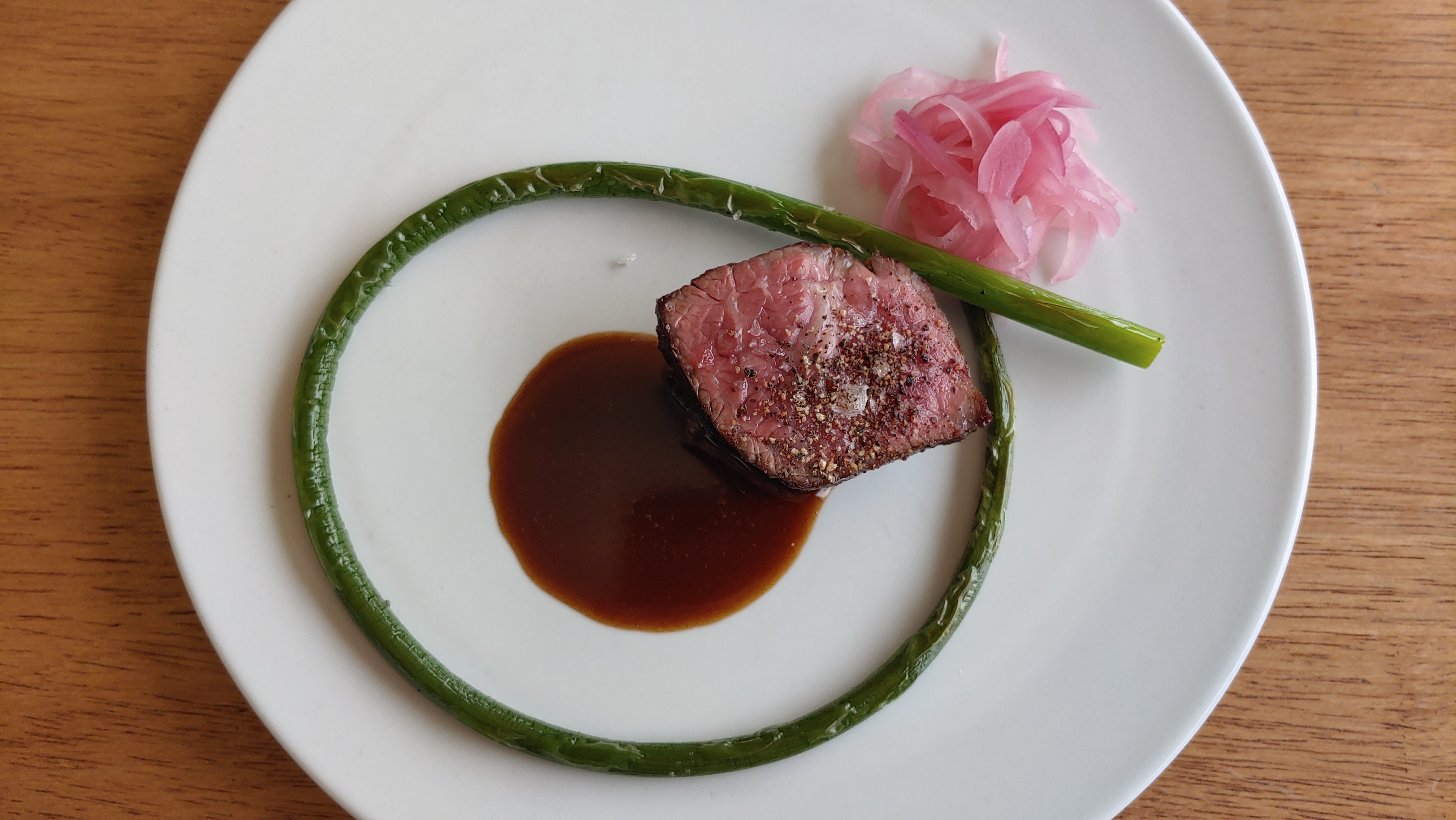 비장탄으로 구운 에이징 살치살에 야채 주(jus)와 적양파 피클, 마늘쫑을 곁들였다. 야채 소스의 캐러멜라이즈드 된 맛이 살치살과 아주 잘 어울렸다. 마늘쫑의 아삭한 식감과 풋풋한 맛 또한 신의 한 수.
