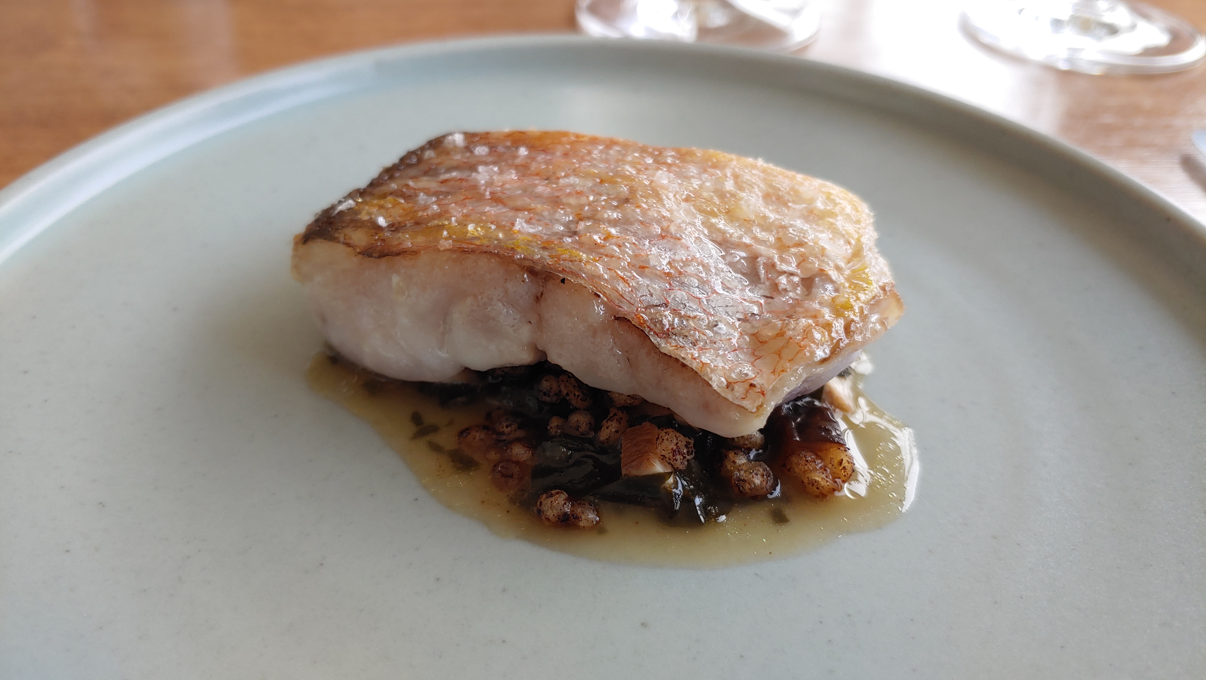 팬 프라잉 한 제주산 옥돔에 피클링한 미역, 표고버섯, 생강 다시 소스, 덴뿌라 크럼을 곁들였다. 곁들인 재료들이 마치 조리퐁 같은 인상을 주었는데, 옥돔과 곁들여 먹으니 식감과 풍미 양쪽이 모두 살아났다.