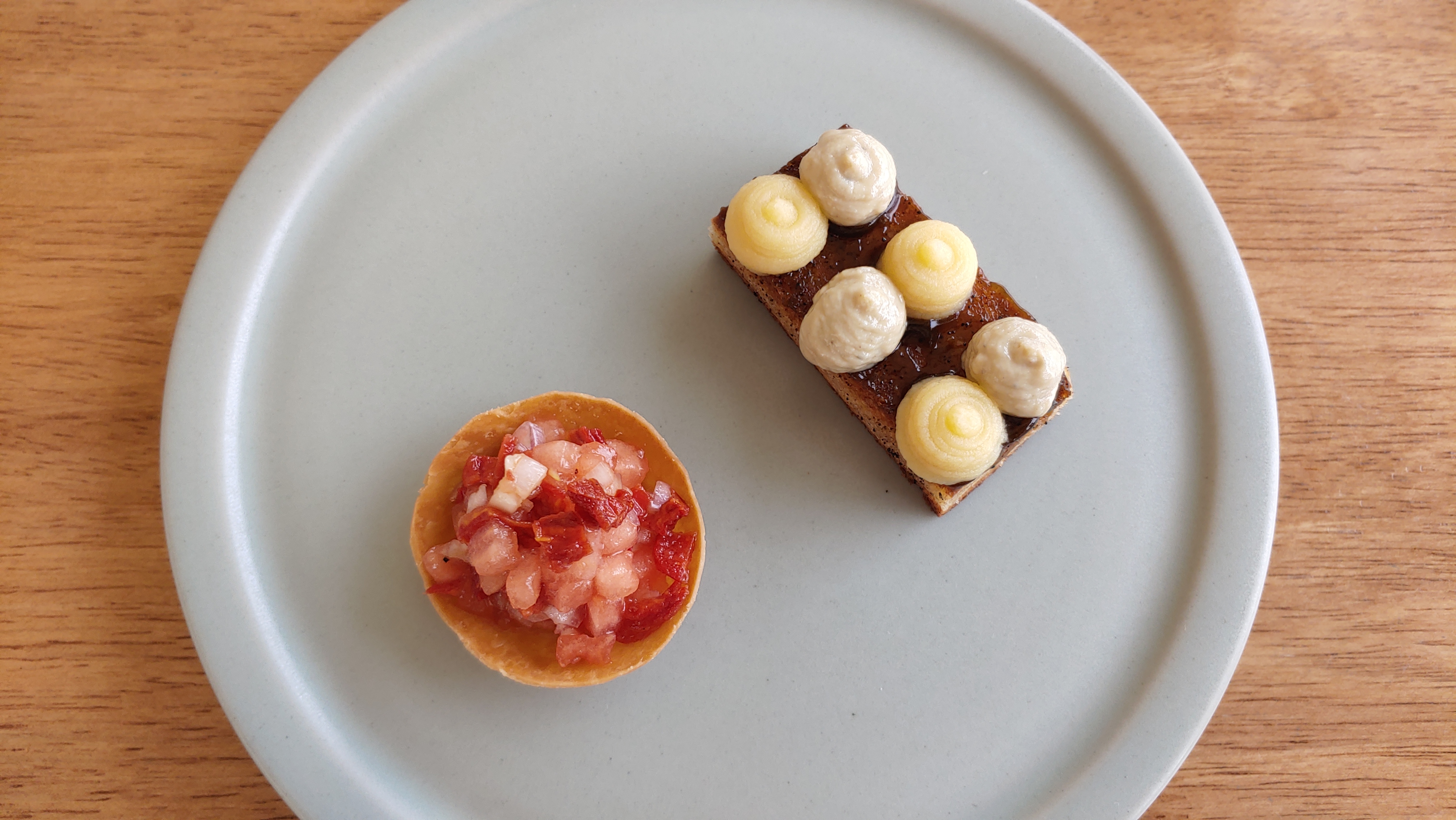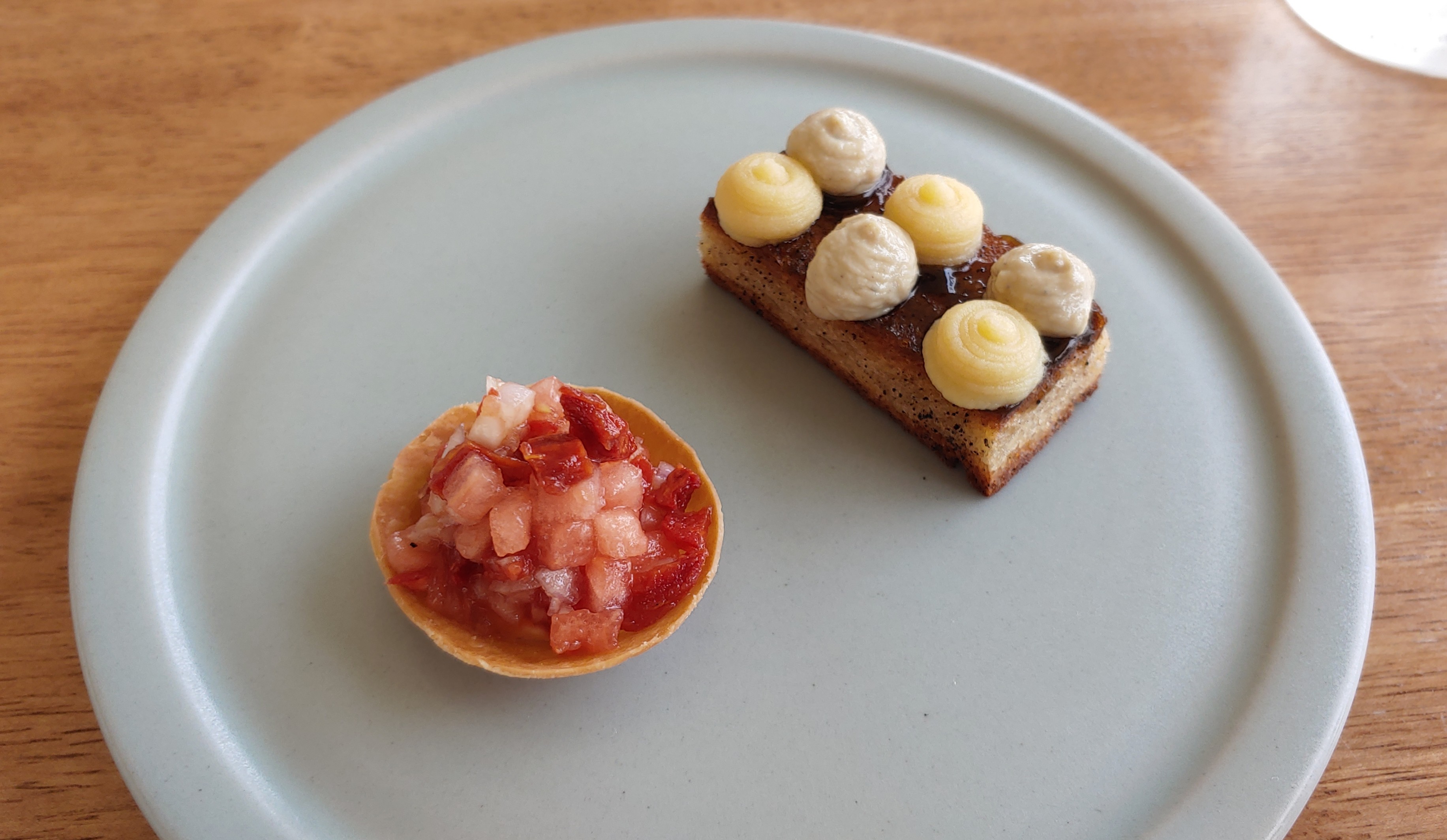 오른쪽은 푸아그라 무스와 애플잼을 올린 브라운 버터 토스트. 왼쪽은 프로마주 블랑, 대저토마토, 수박 타르타르를 올린 타르틸렛. 입맛을 돋우기에 딱 좋은 맛과 사이즈다.