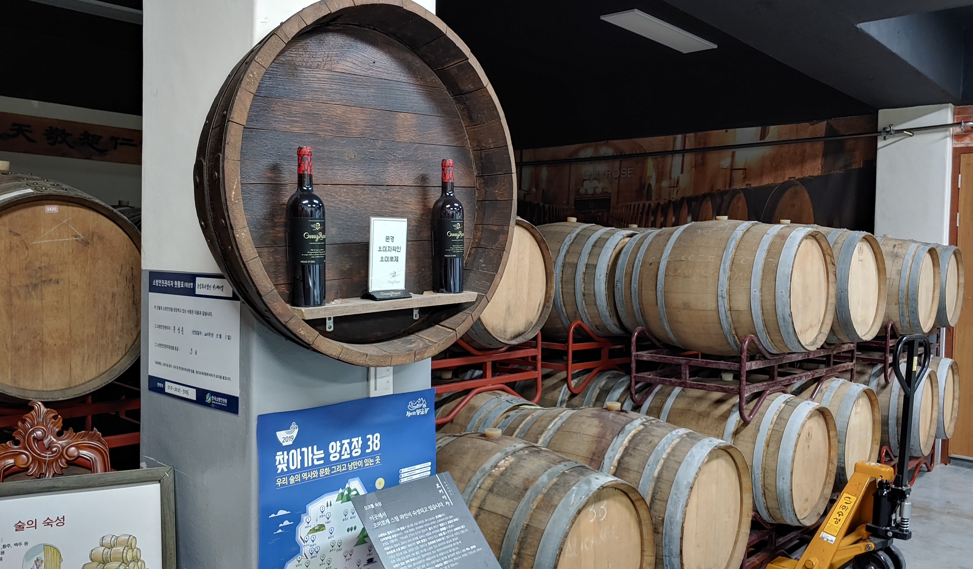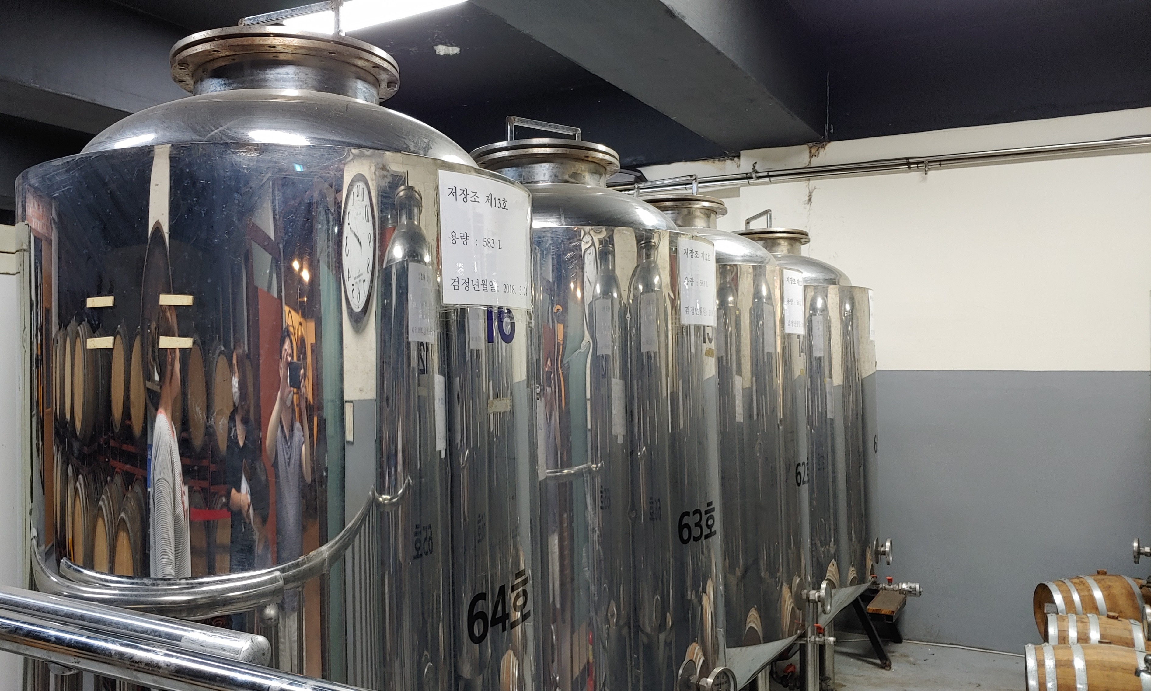 발효실에 들어가면 오른쪽에 스테인리스 스틸 탱크가 있다. 여기서 일단 18개월간 1차 발효를 진행한다. 오미자는 발효가 어려운 편이라 발효에 오랜 시간이 필요하다고. 또한 오랜 숙성이 오미자의 쓴맛과 매운맛을 완화해 부드럽게 만들어준다고 한다.