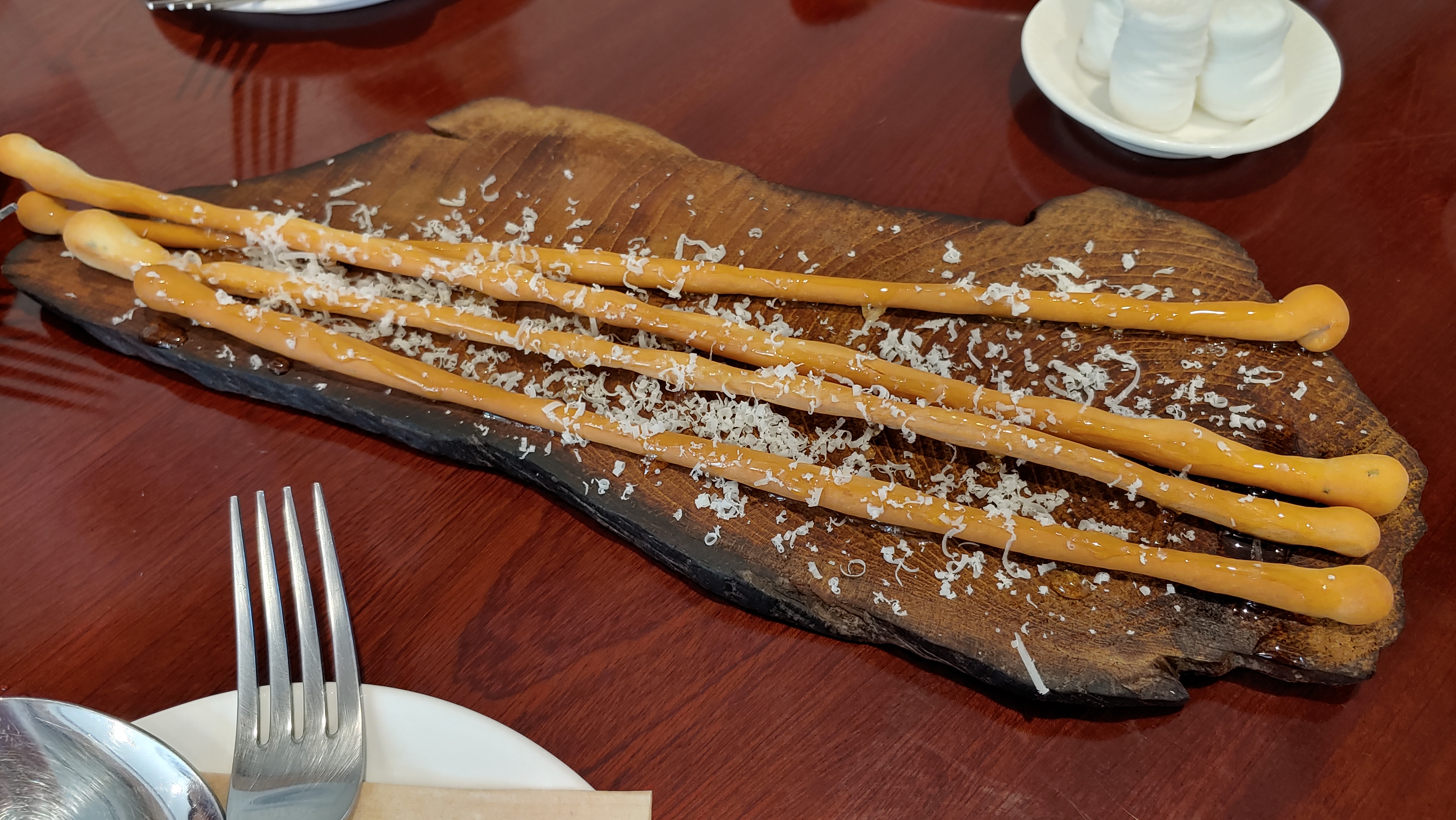 애피타이저. 바삭한 과자에 시럽과 치즈를 뿌려서 맛을 냈다.