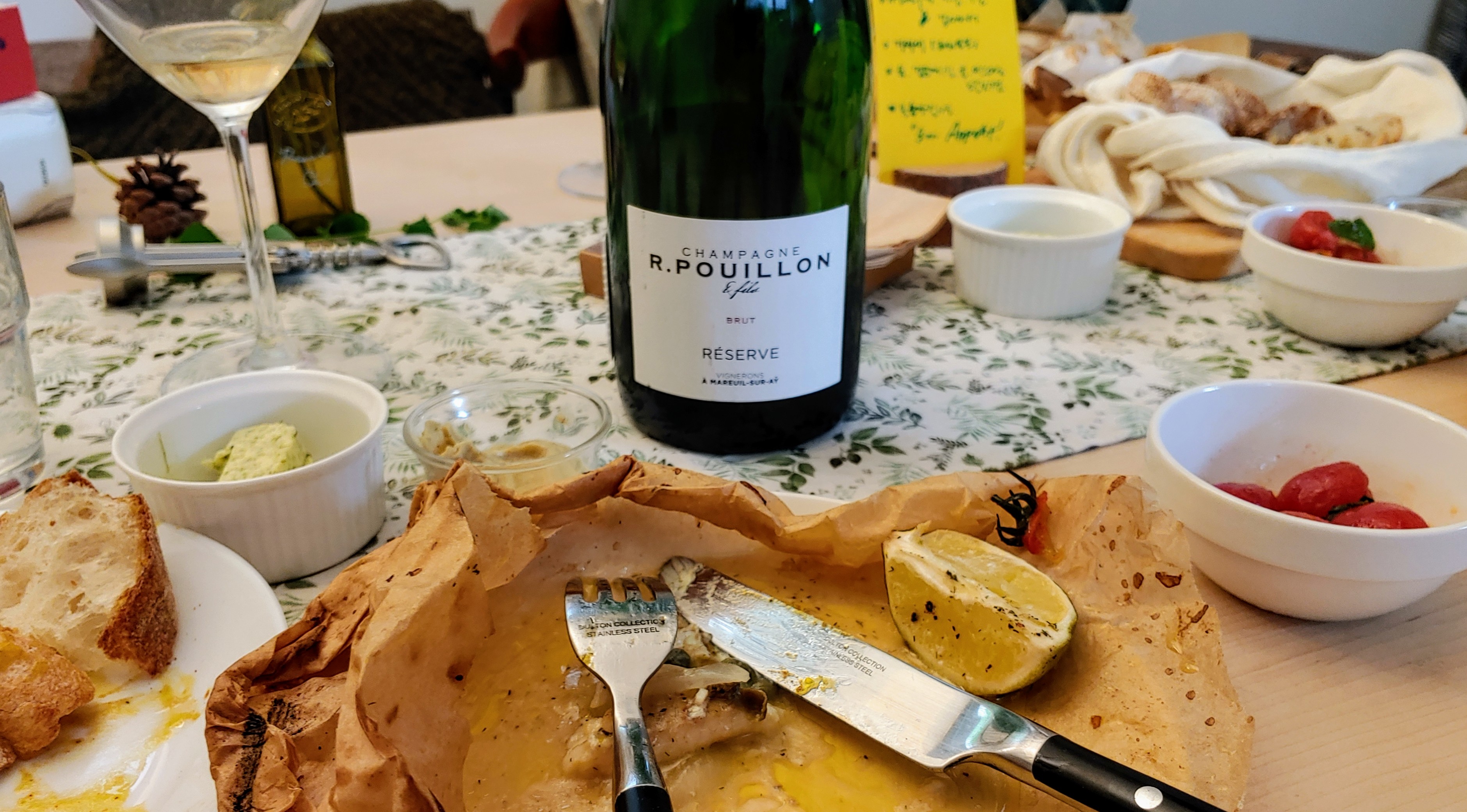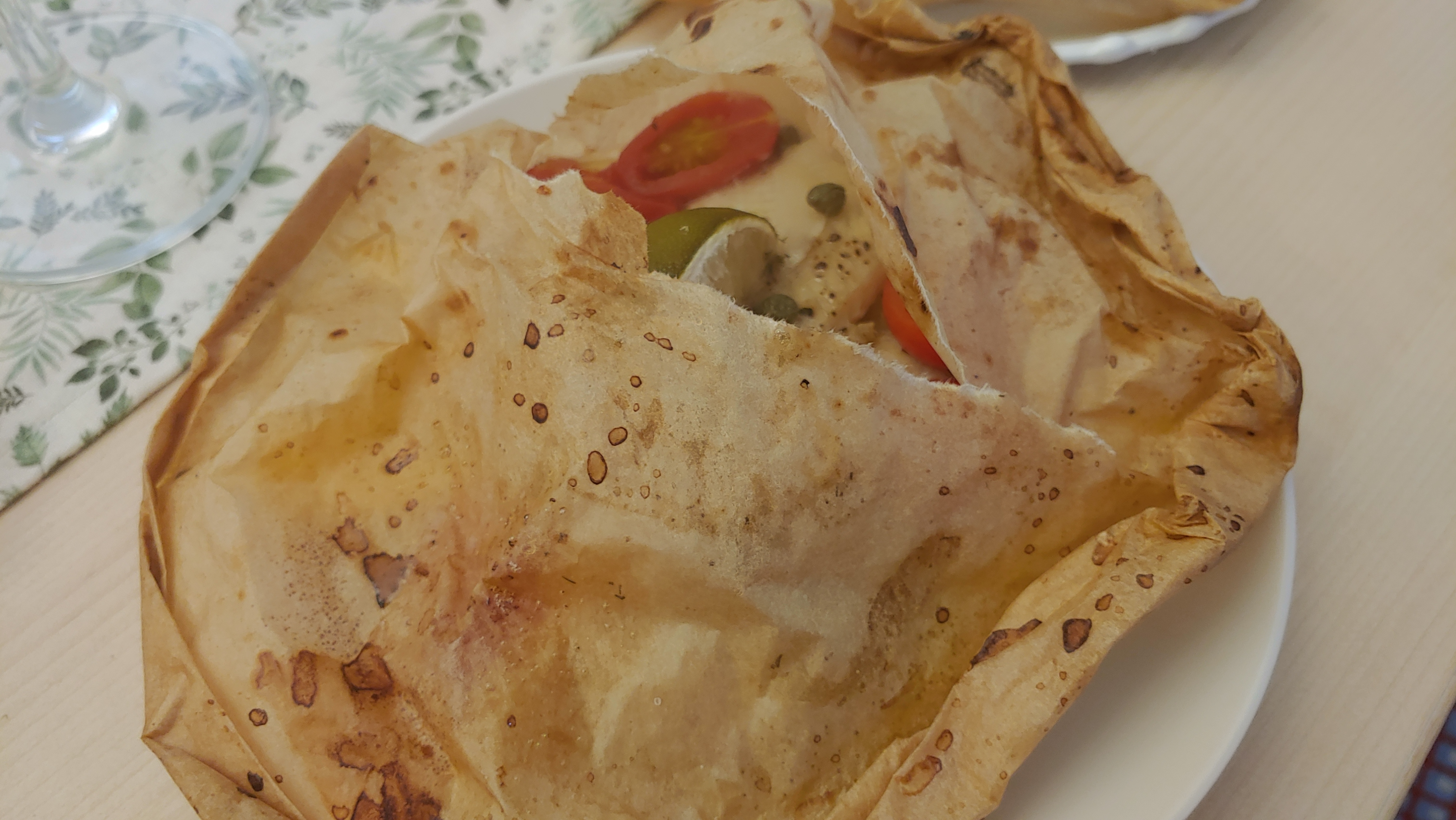 가자미 파피요트. 종이를 열면 슬쩍 들여다보이는 내용물과 함께 피어나는 향긋한 재료의 향이 기대감을 증폭시킨다.