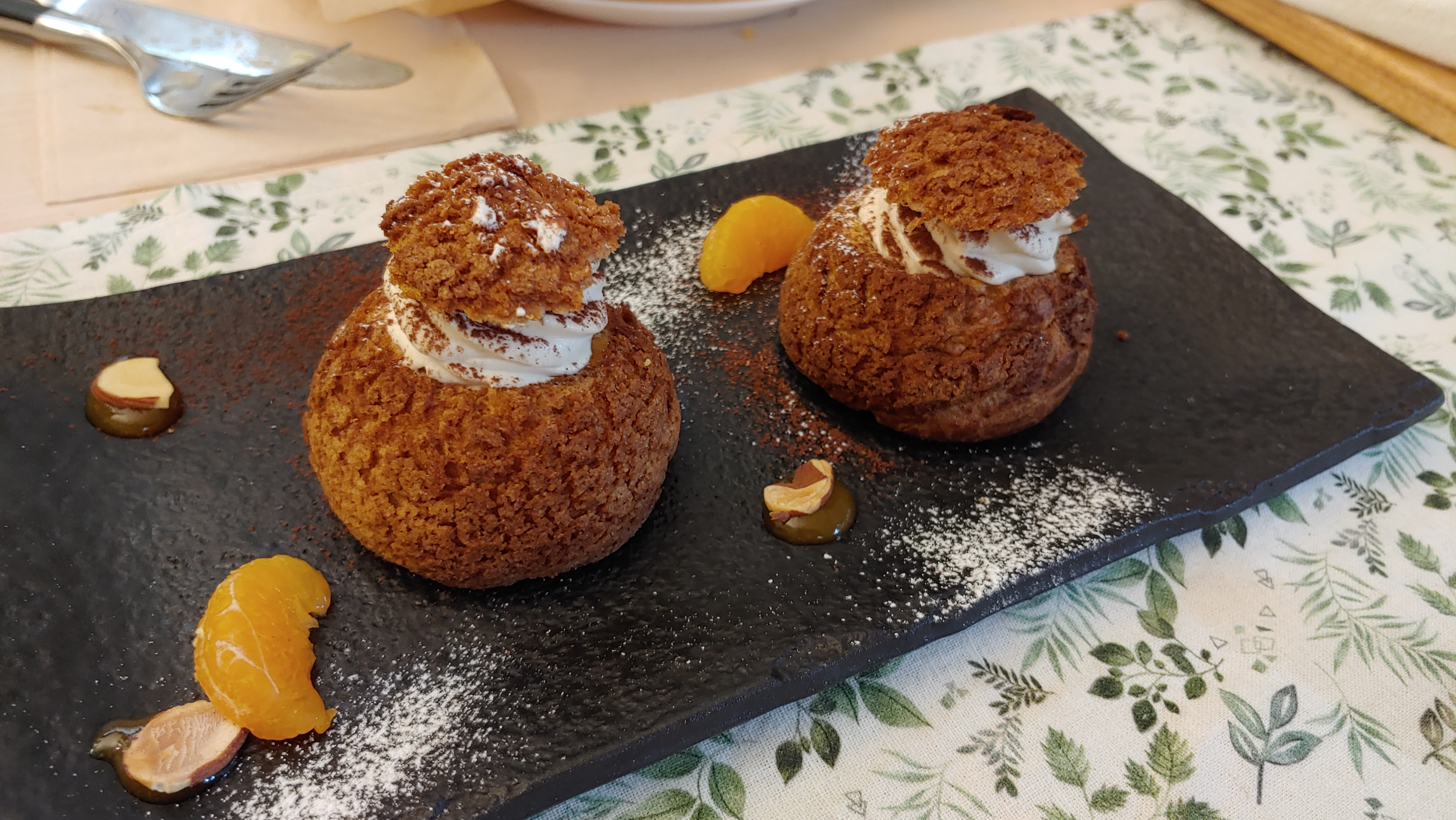 흑임자 크림, 귤, 머스코바도 초콜릿 크림을 곁들인 슈.