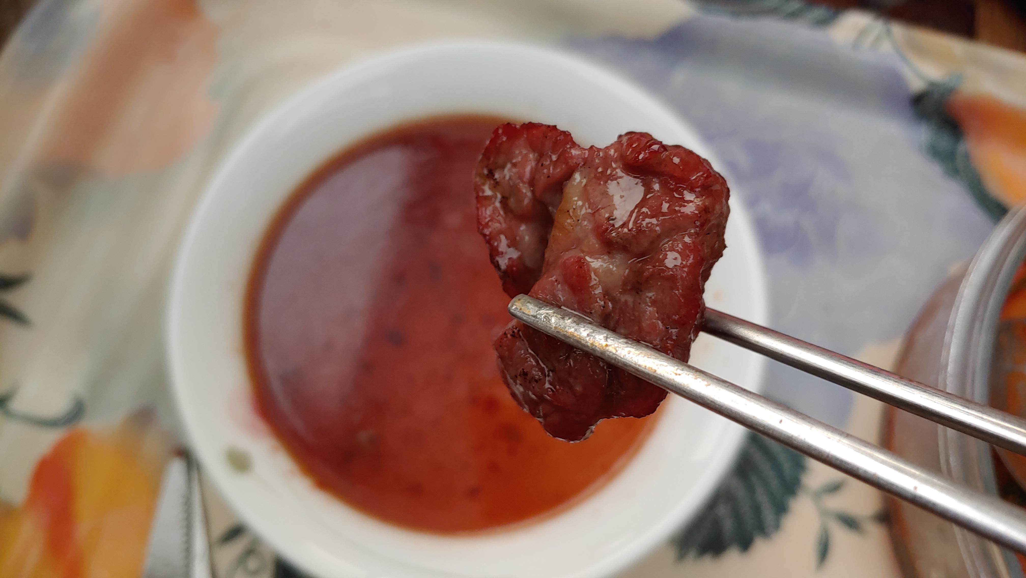 그리고 동봉된 소스에 찍어서 한 점.... 캬, 이거 대박임♥ 앞으로 소고기 대신 이치류 양고기 사서 와얄 듯. 가성비도 뛰어난데 절대적인 맛 또한 훌륭하다. 다음엔 갈빗살도 살 수 있기를...