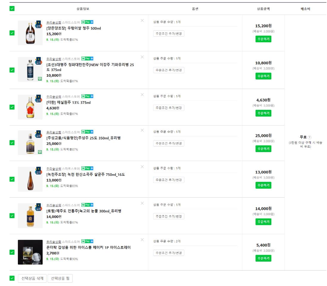 고민에 고민을 거듭한 끝에 최종 선택한 우리술들입니다. 그래도 5만 원은 초과했네요ㅋㅋㅋ 구매하지 않은 술들은 장바구니에 고스란히 남아있으니 다음을 기약해야겠죠^^;;