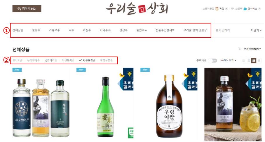 우리술상회 같은 우리술 전문 사이트의 장점은 여러 생산자의 다양한 술을 한 번에 구매할 수 있다는 것입니다. ① 증류주부터 리큐르, 약주, 과실주 등 다양한 전통주를 원하는 타입 별로 볼 수 있고, ② 인기도, 누적 판매량, 최신 등록, 리뷰, 가격 등 다양한 기준으로 정렬도 되니 선택하기도 좋습니다.
