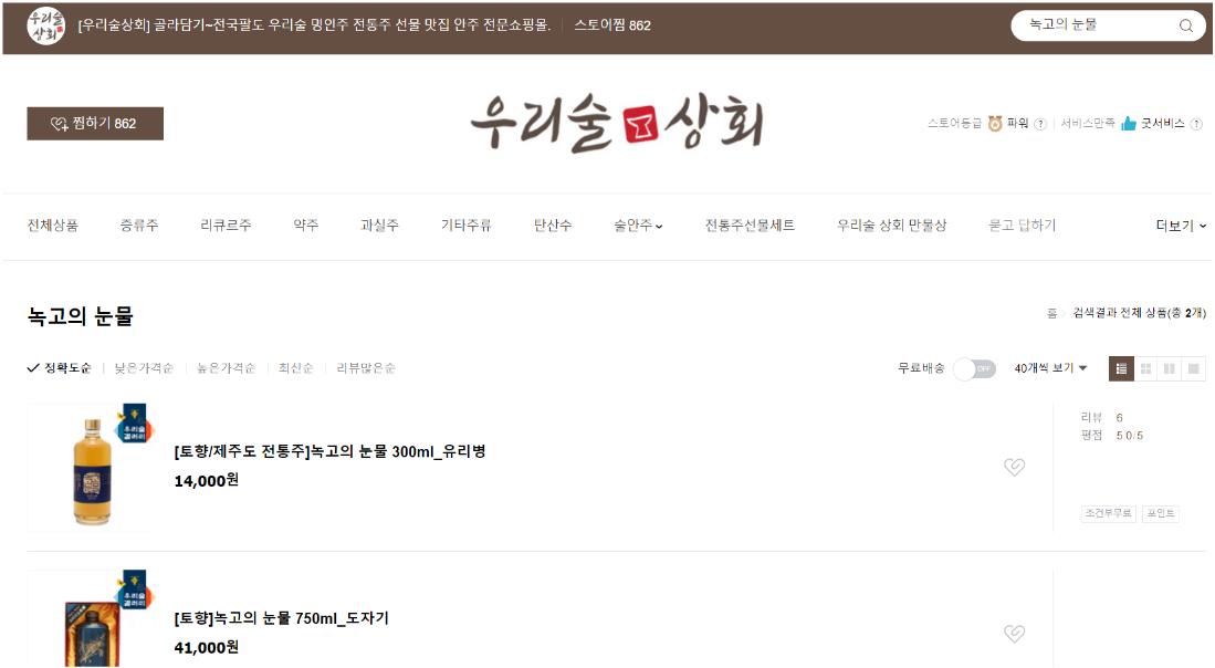 먼저 평상시 관심이 있었던 녹고의 눈물을 검색해 봅니다. 300ml 유리병 버전과 750ml 도자기병 버전 두 가지가 나오네요. 원래는 제주도 여행 가면 꼭 들러서 맛보고 구매하려고 했던 술인데, 이놈의 코로나 때문에 제주 여행을 못 가다 보니...ㅠㅠ