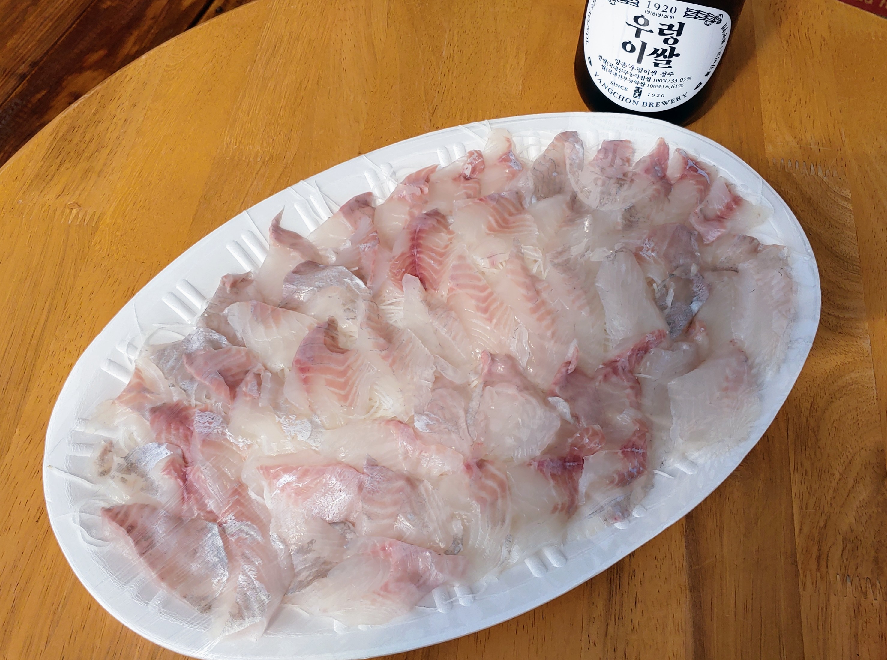 안주는 구리 수산물시장에서 떠 온 돌돔 회. 좋은 술에 어울리는 좋은 안주다.