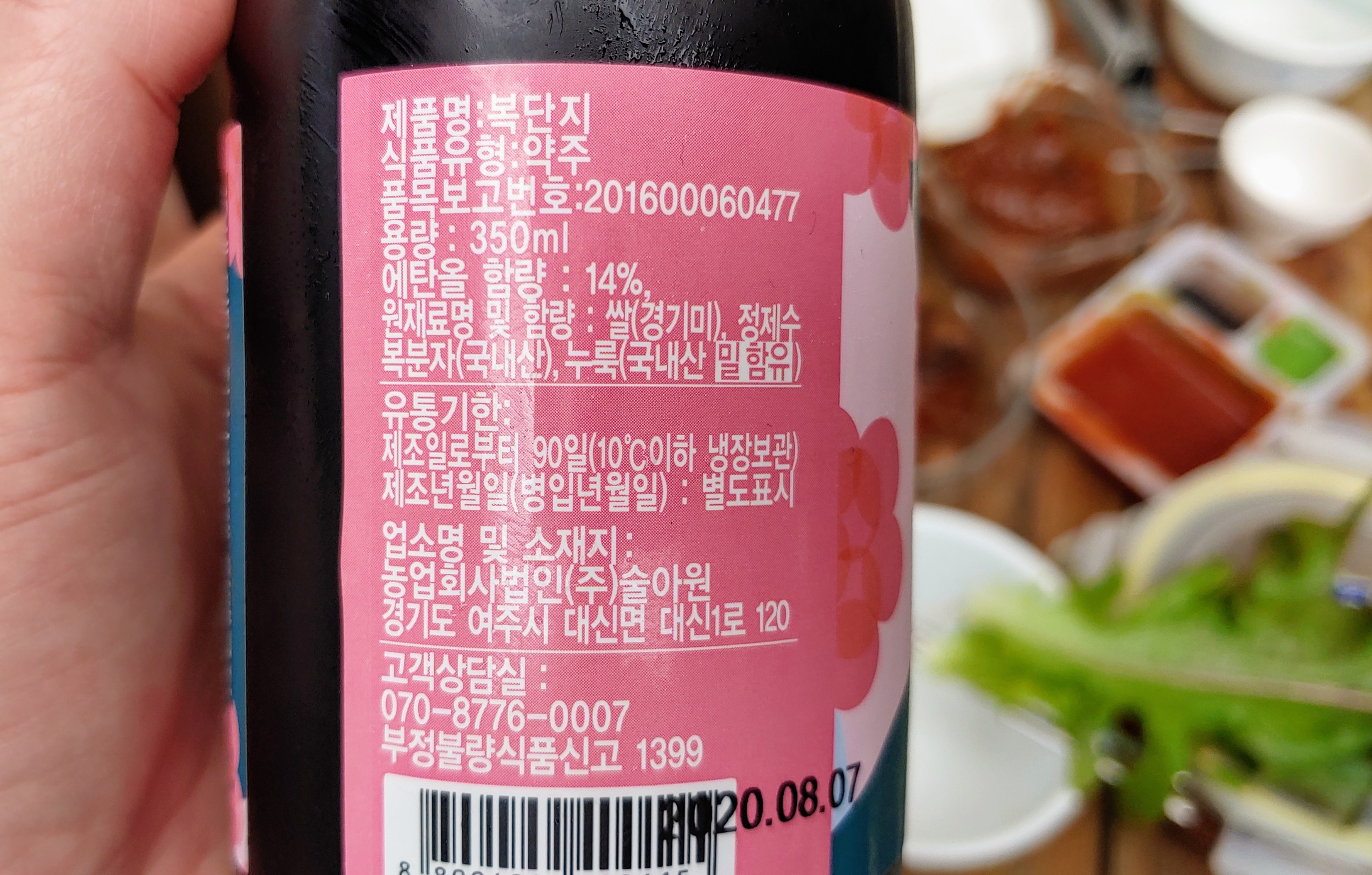 원재료는 정제수, 경기미, 국내산 복분자, 누룩. 그냥 복분자에 설탕을 넣어 담근 과일주가 아니라, 경기미를 사용한 약주에 복분자를 사용해 맛을 낸 것이다. 알코올 함량은 14%. 냉장 보관으로 유통기한 90일인 것을 보면 비살균 약주인 듯.
