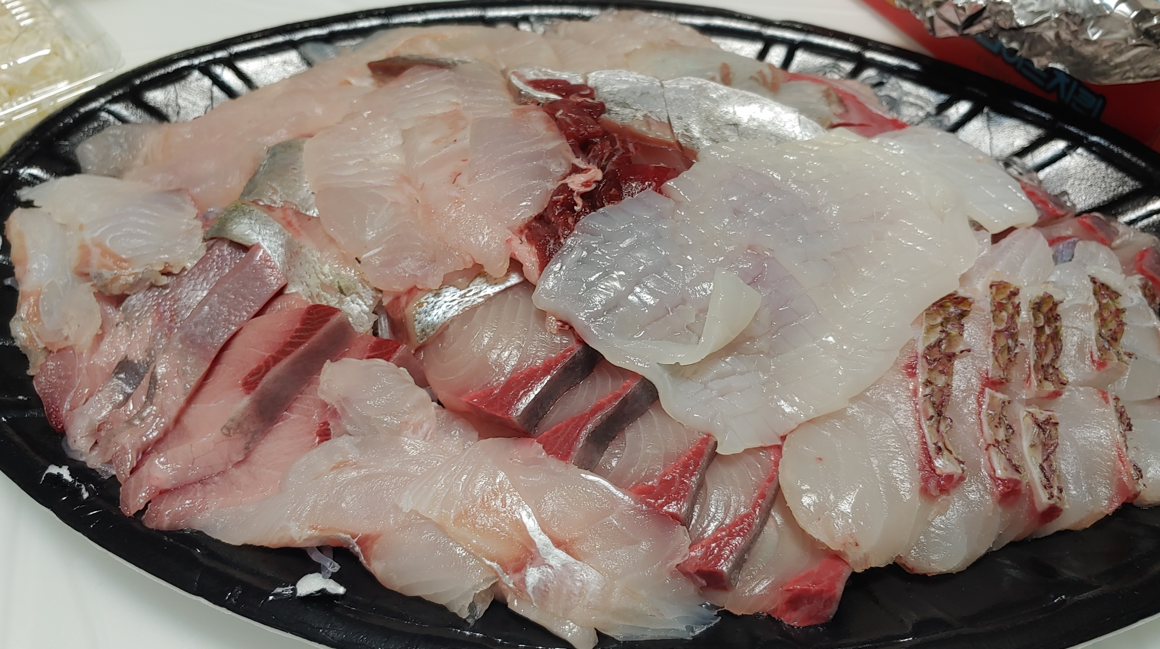 쿠마 익스프레스를 통해 배달한 회. 정말 맛있고 신선한, 두툼하게 썬 다양한 회들.