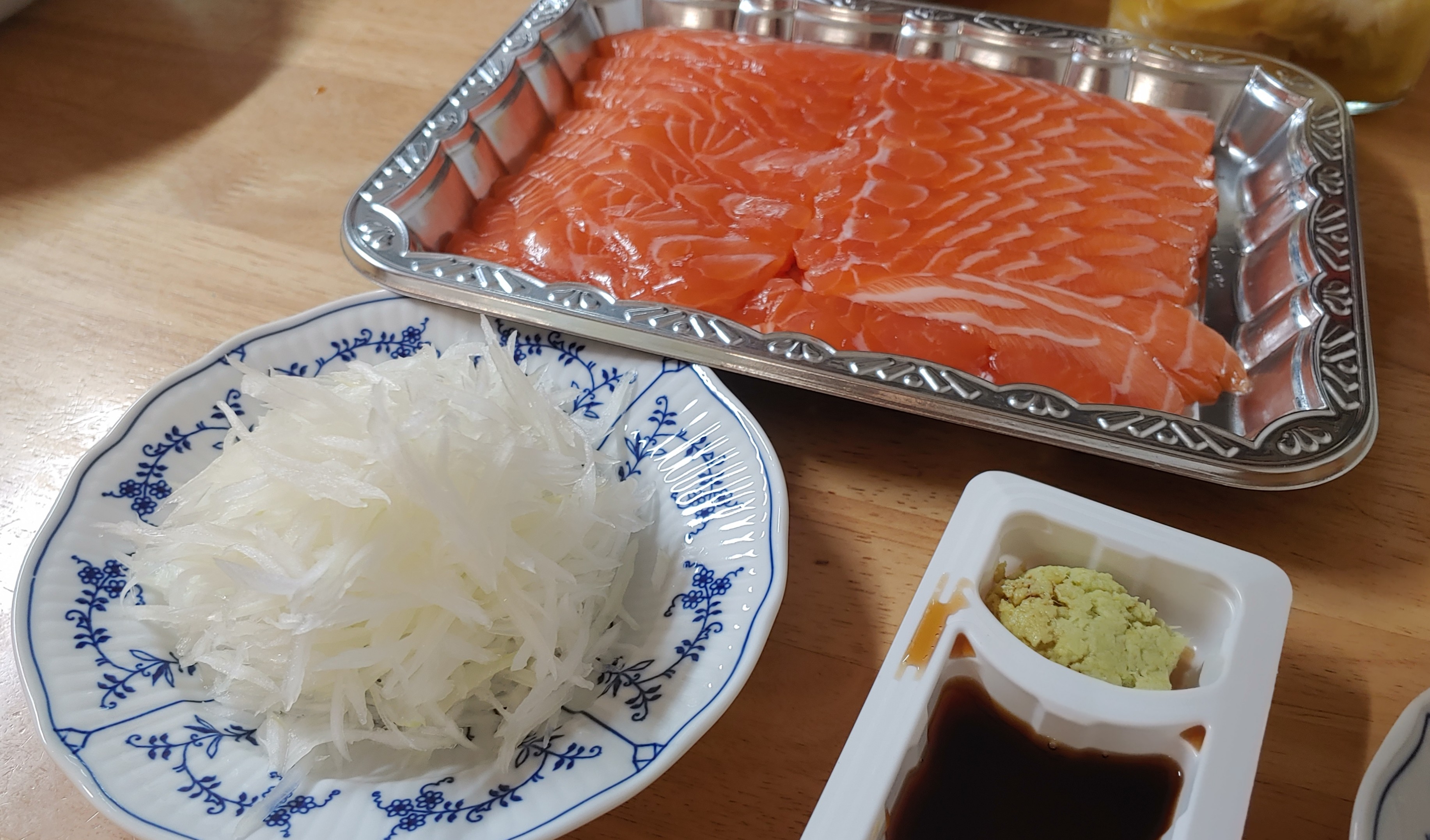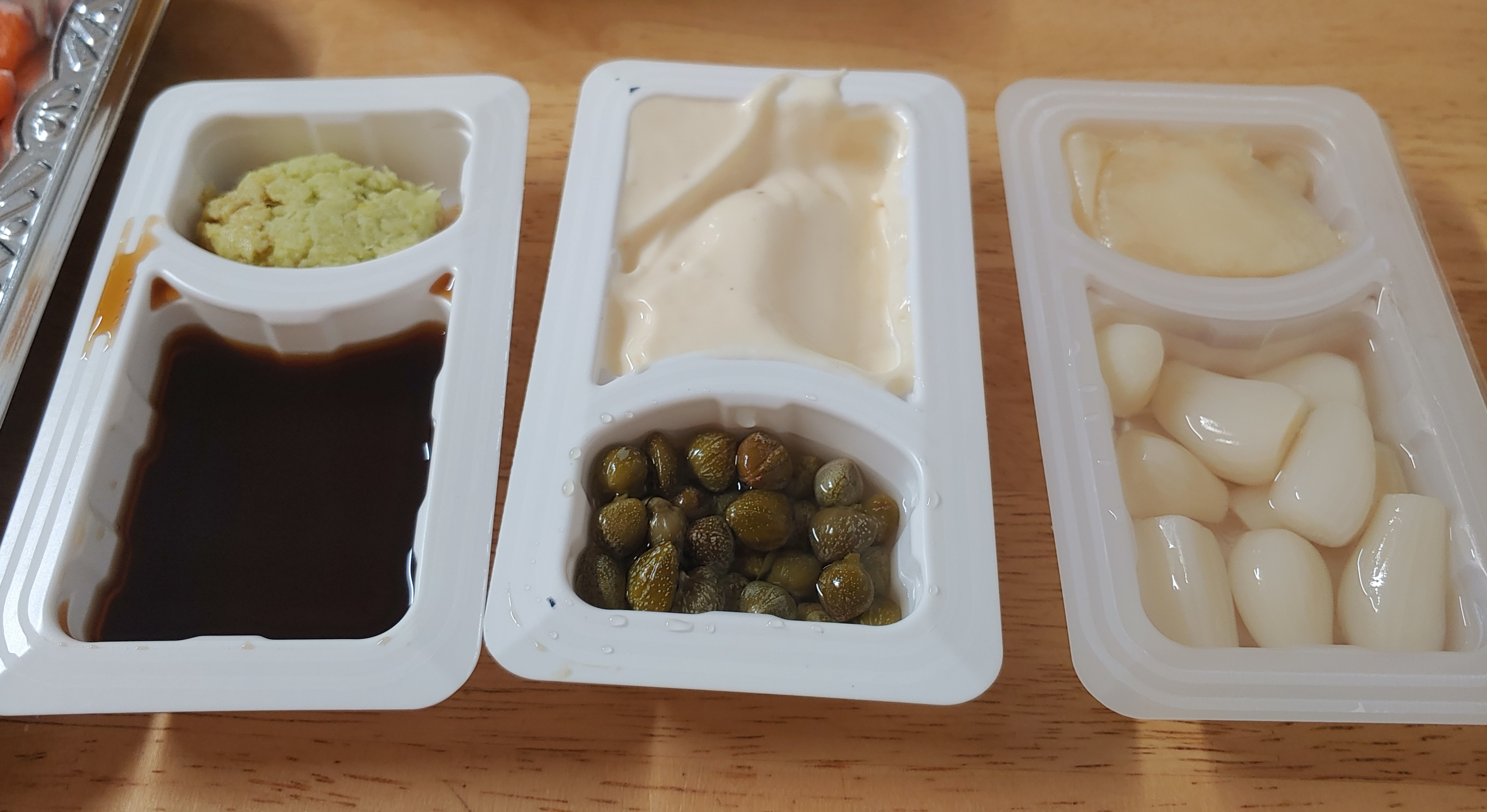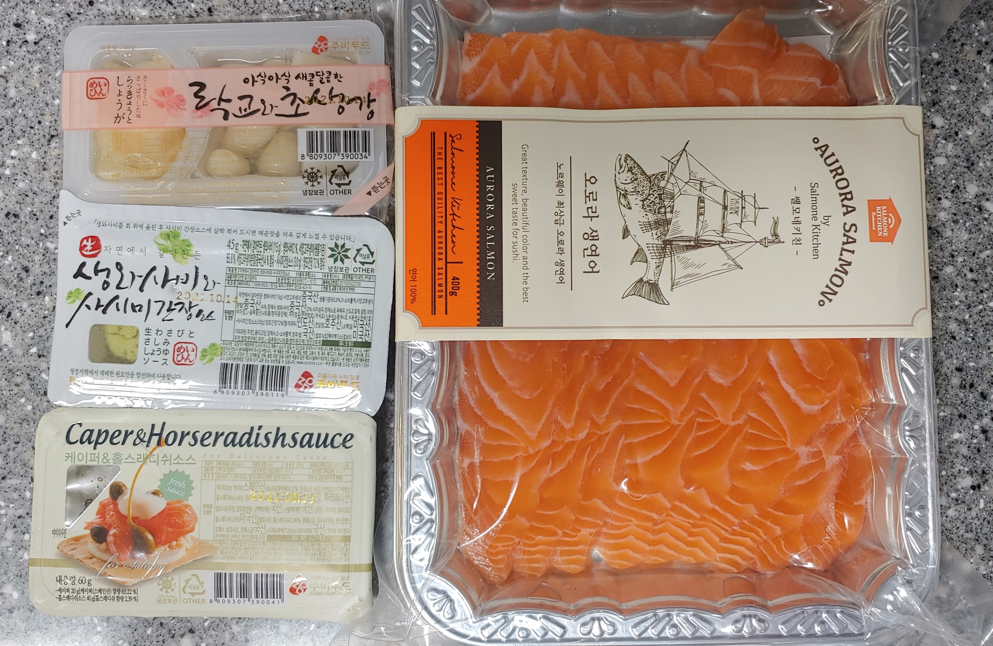 곁들일 소스들도 종류별로 준비했다. 케이퍼 & 홀스래디시 소스, 생 와사비와 사시미 간장, 락교와 초생강까지...