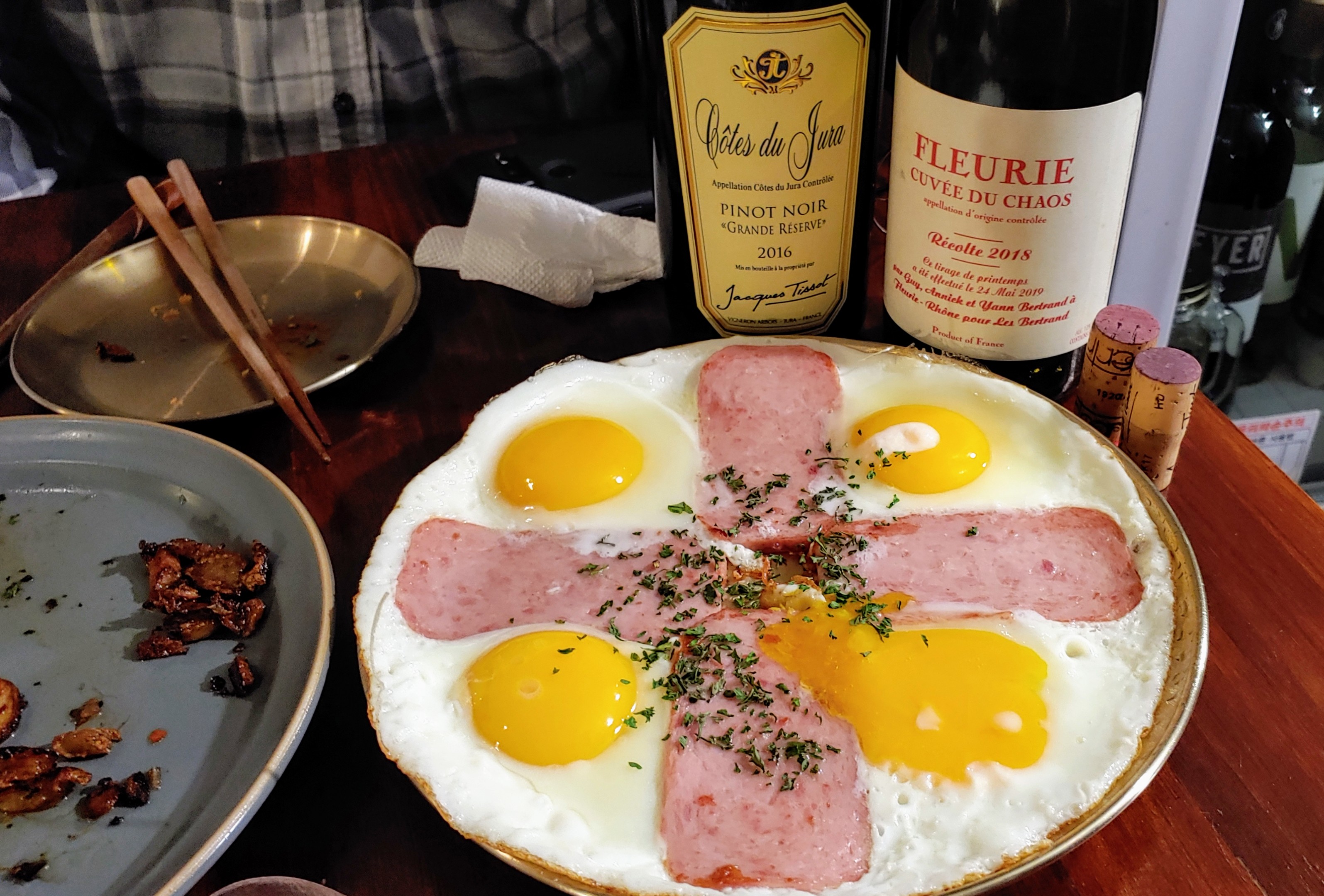 맛있었던 치킨은 왼쪽에 마늘 흔적만을 남긴 채 사라졌고, 스팸&계란이 맛깔스럽게 등장.