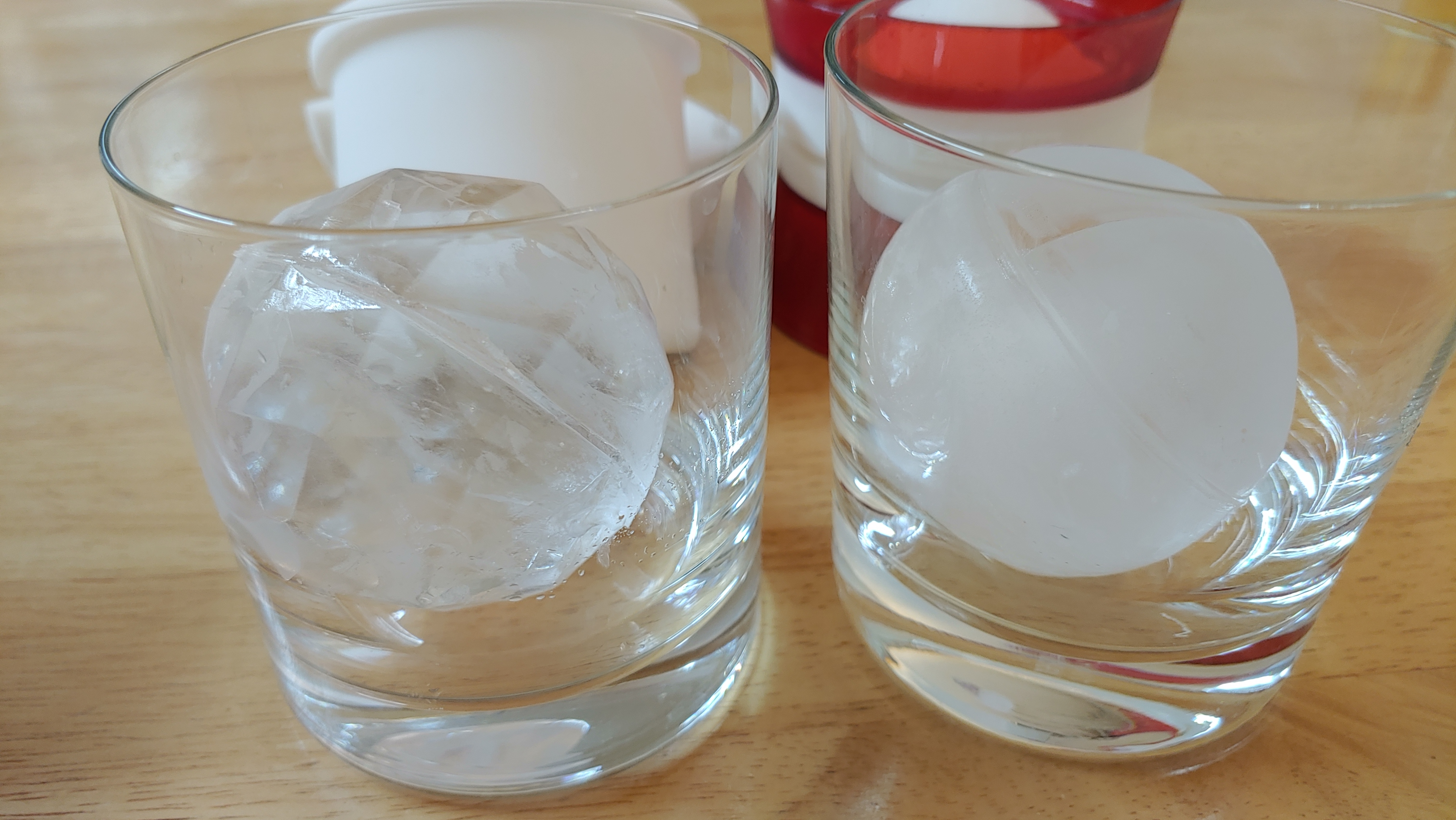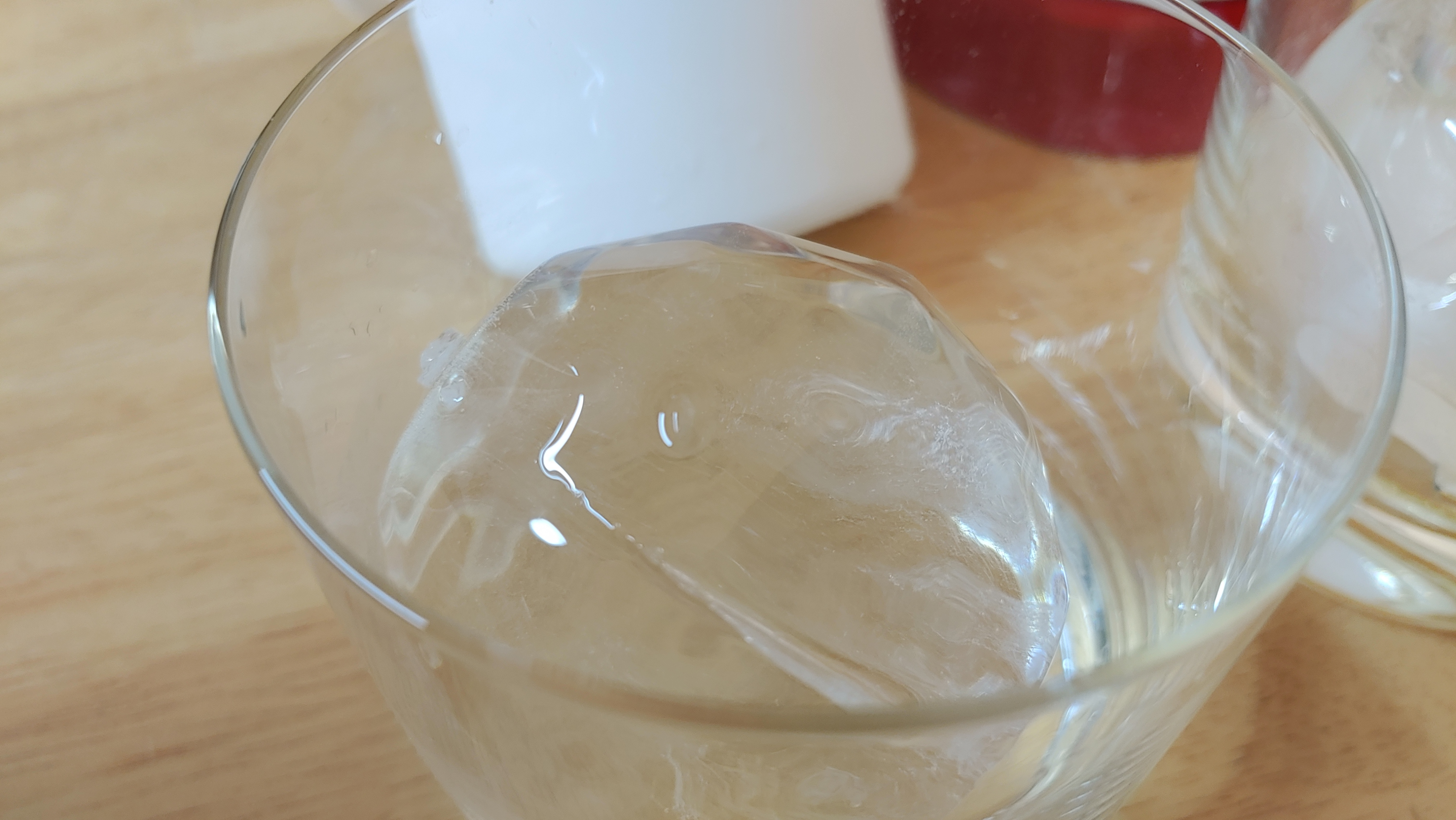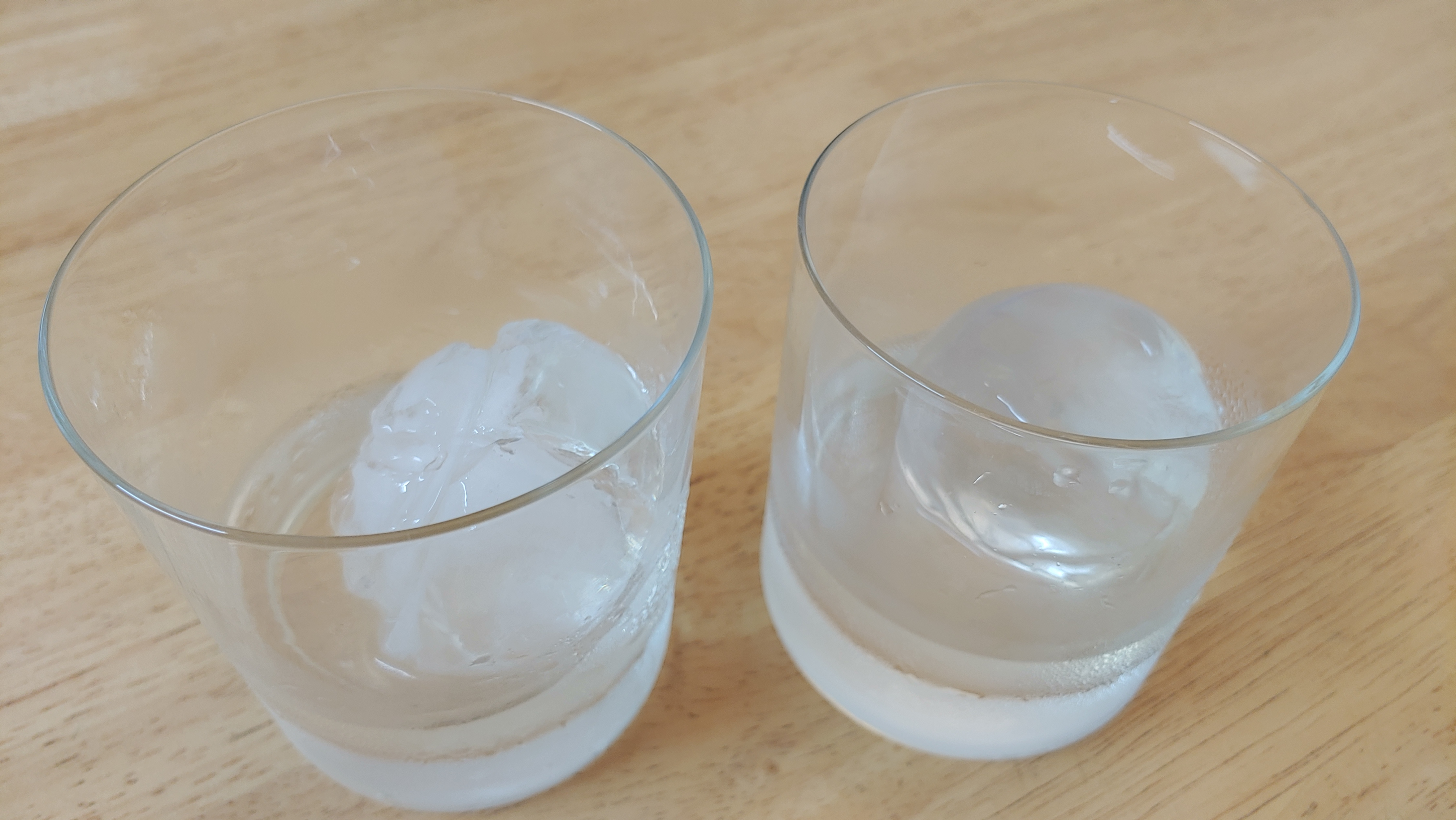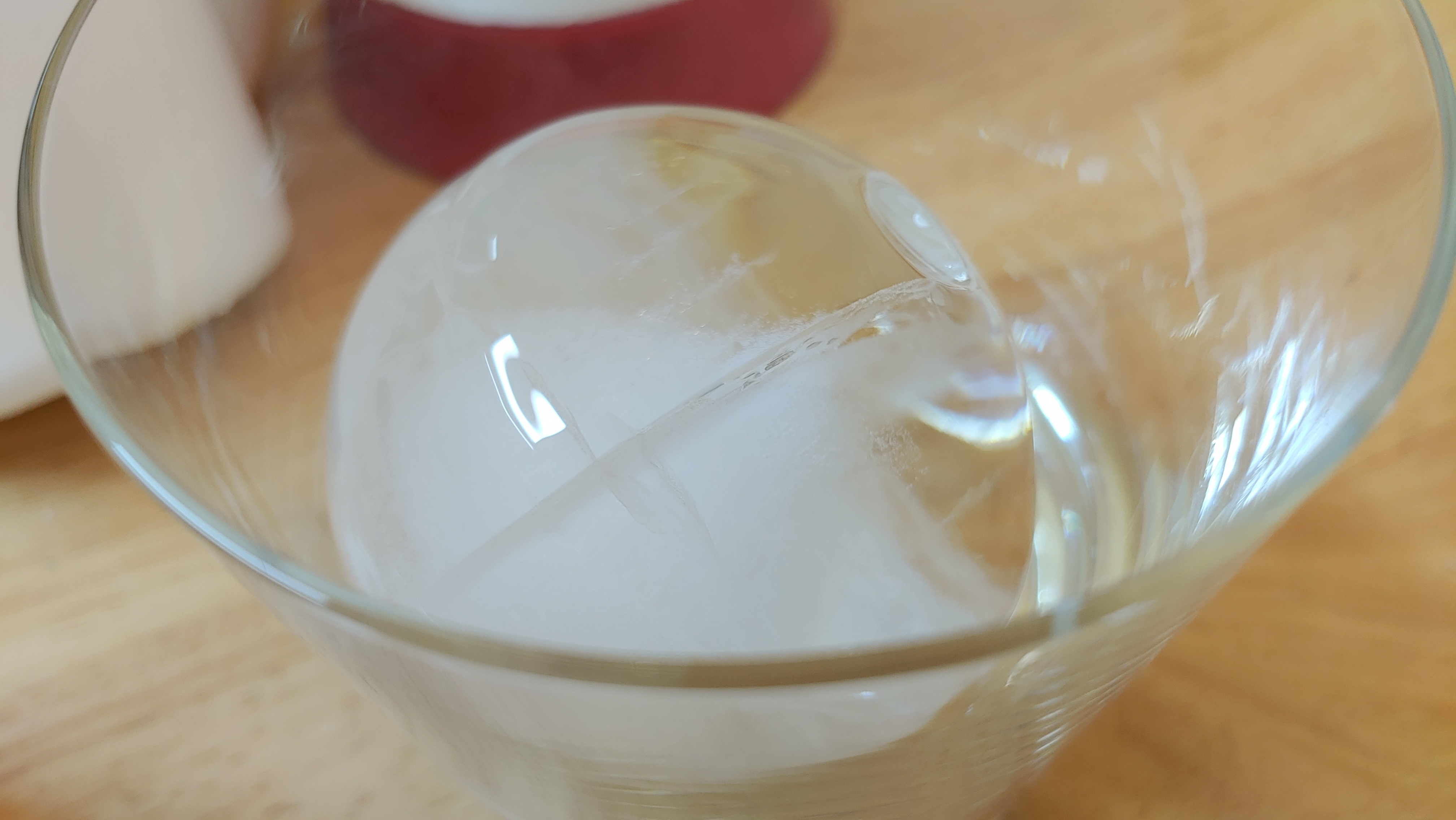 온 더 락 글라스에 넣어 보았습니다. 공기가 빠져나가지 못한 부분이 조금 있긴 하지만 전반적으로 맑고 깨끗합니다. 갑자기 광고 카피가 떠오르는군요.